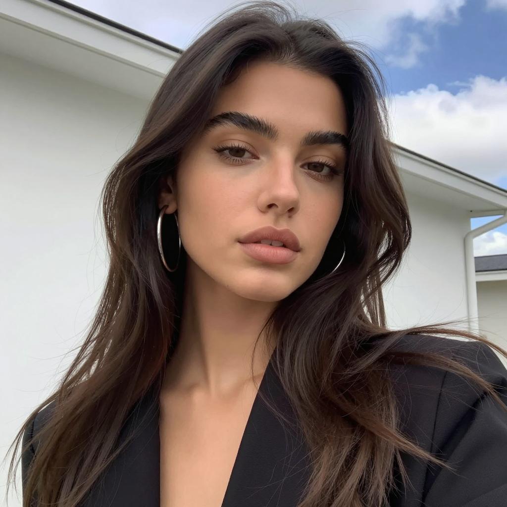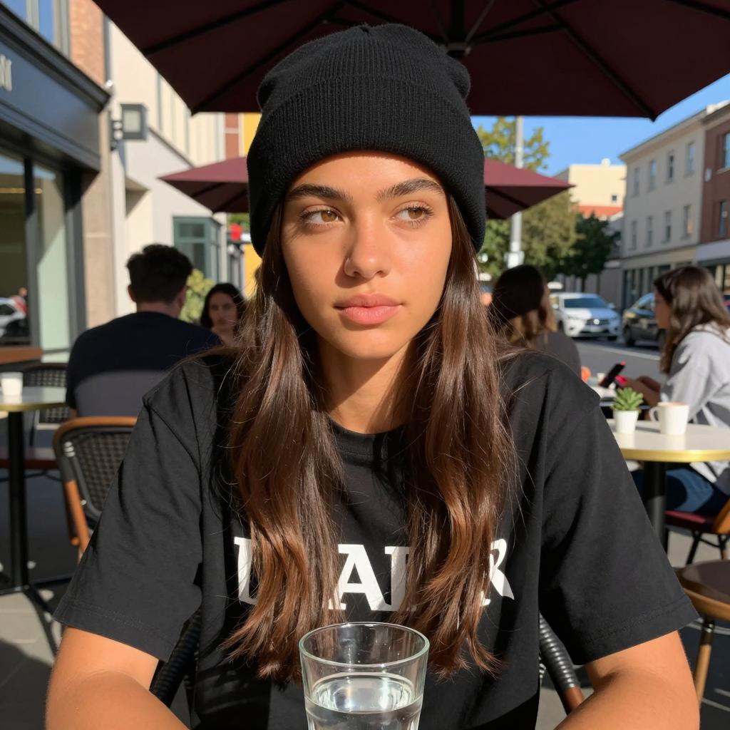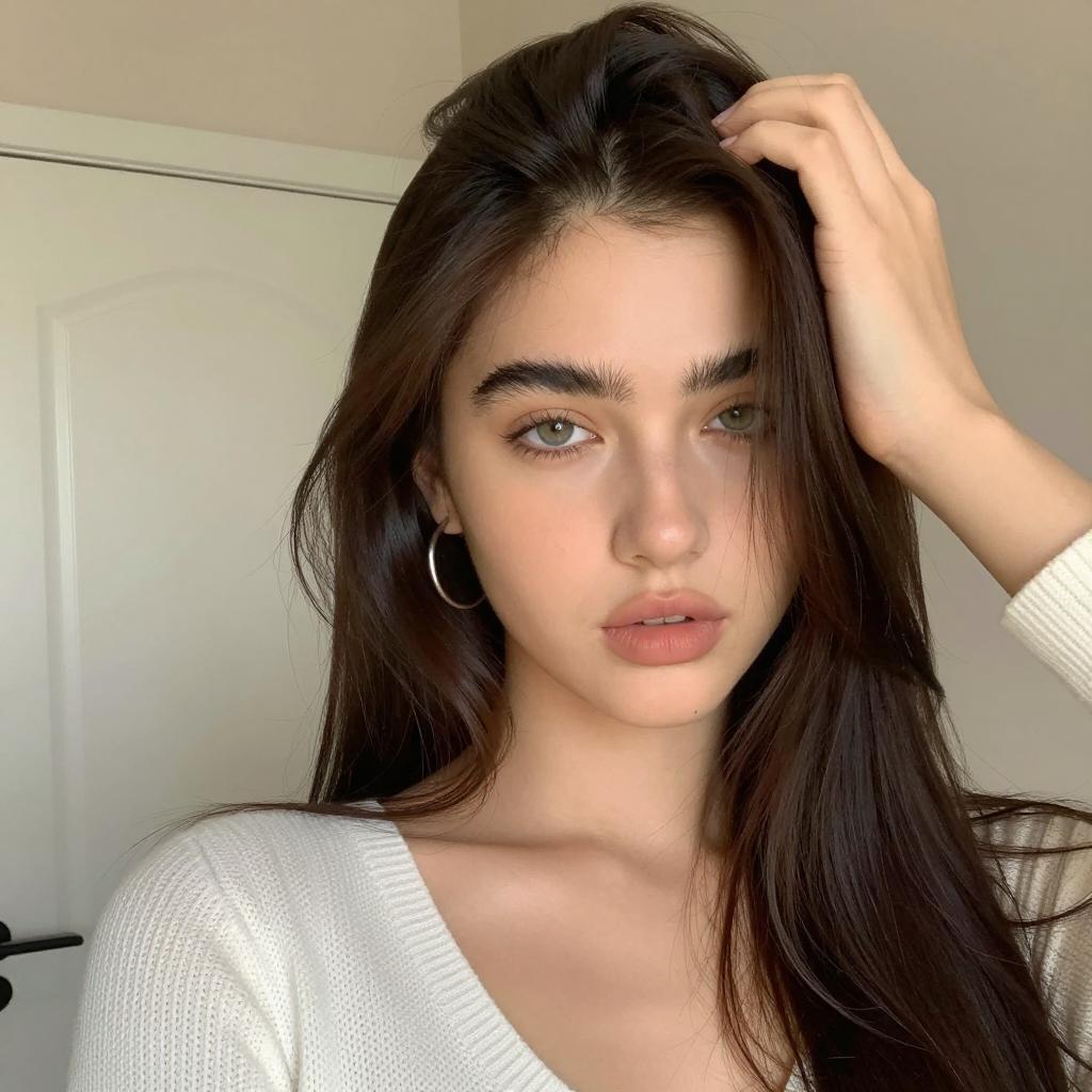 Young woman with light brown skin and straight brown hair, wearing a gray hooded sweatshirt with the hood up, pouting her lips. Sunlight shines on her face. She is inside a car with beige seats. Left arm extended for a selfie. Text "EMPIEZA EL VIAJE" on the car's ceiling.