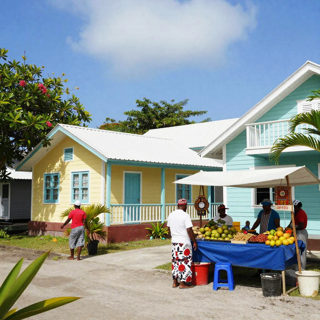 Caribbean coastal village with charming pastel-colored houses, lively market stalls with tropical fruits and spices, locals in traditional attire, lush greenery around, and a clear blue sky, evoking a warm and inviting island atmosphere.