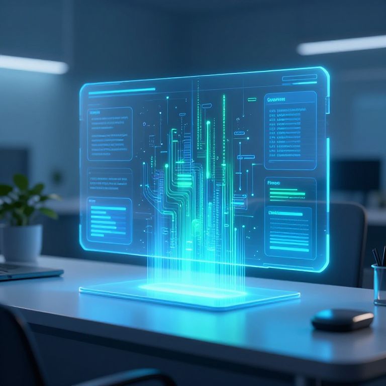 Photograph of a futuristic, glowing blue, holographic computer screen displaying circuit-like data on a modern office desk with a plant and pen.
