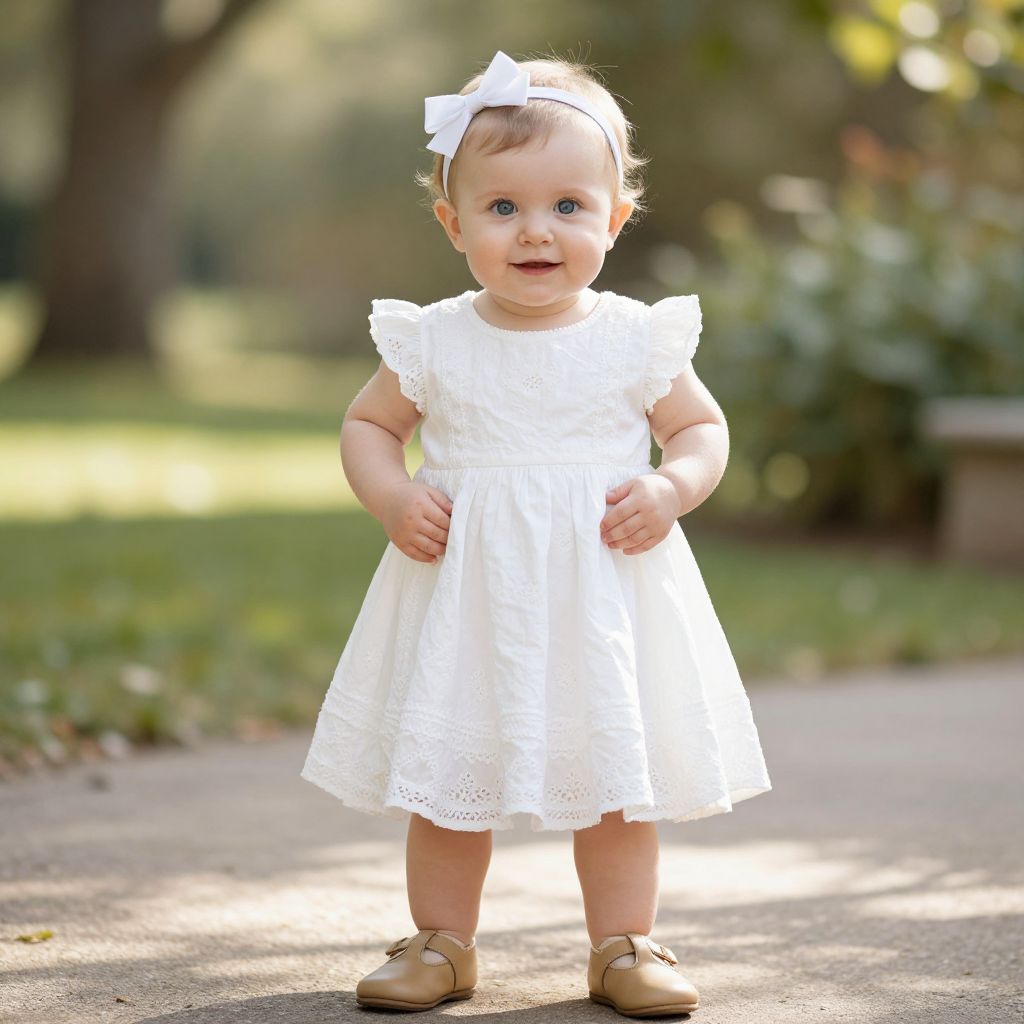 A baby girl with soft, fair skin and big, curious blue eyes stands confidently with her hands on her hips. She wears a delicate white dress that flows gently around her, a small white bow tied neatly on her head, and a matching white headband that adds a touch of elegance. She has a sweet, joyful expression and is dressed in tan shoes that complement the overall soft, classic look. The scene is bright and warm, with soft sunlight filtering through a gently shaded garden, creating a peaceful and charming atmosphere.