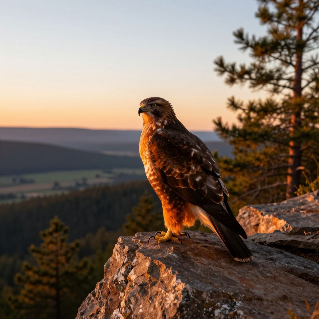 Hawk a lugi resting calmly on a rocky cliff edge at sunset, detailed plumage glowing in warm orange light, panoramic view of vast wilderness with pine trees and valley below, ultra-realistic environment with gentle breeze effects on feathers