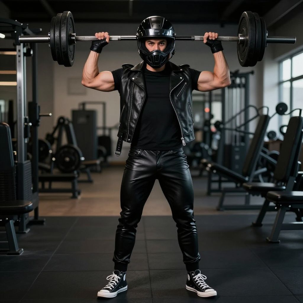Photograph of a muscular man in a dimly lit gym, wearing a black leather helmet, black leather jacket, black shirt, black leather pants, and black sneakers with white laces. He is lifting a heavy barbell with both hands, wearing black fingerless gloves. His face is partially covered by a black face mask. The gym background includes various exercise equipment, such as weights, benches, and machines, creating a dark, industrial atmosphere. The man's strong, defined arms and intense focus are prominent in the image.