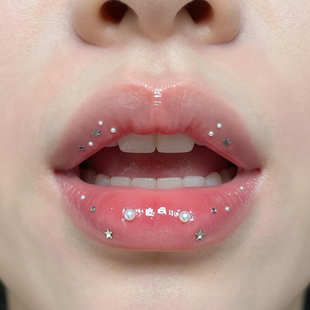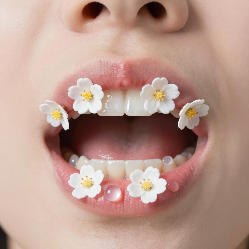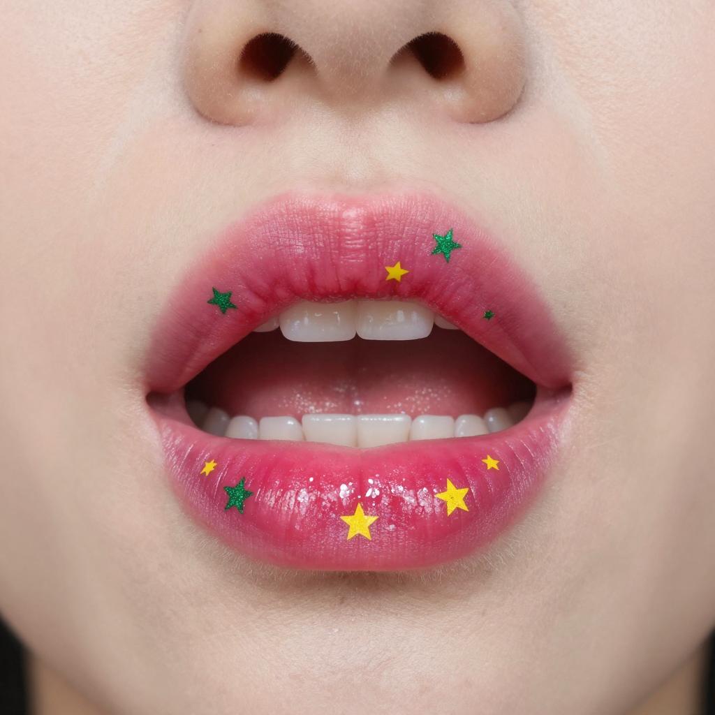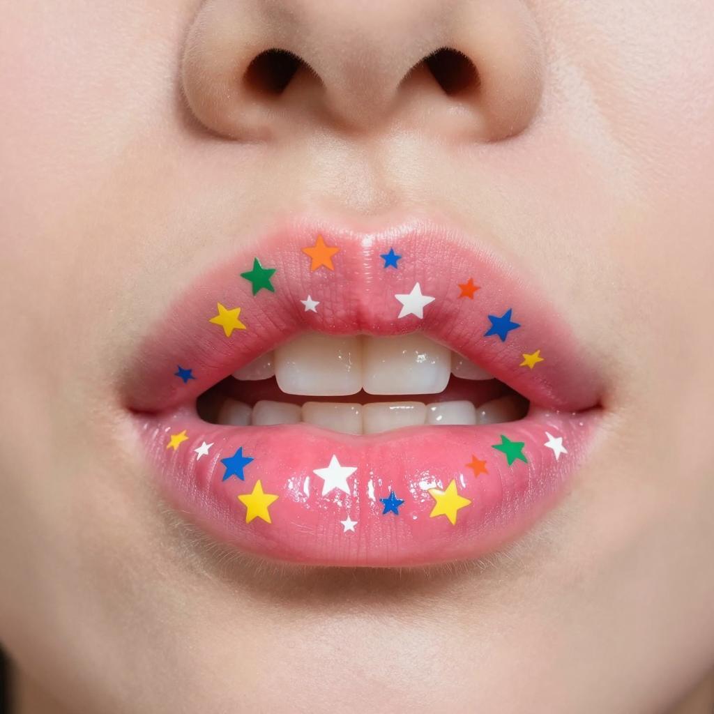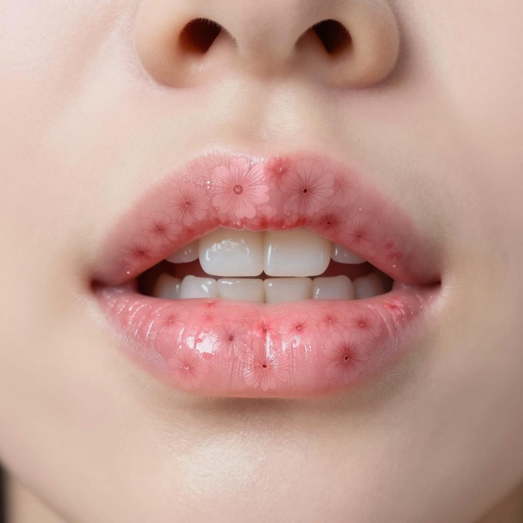 Close-up photograph of full lips with a glossy pink surface, covered in small, detailed, pink floral patterns. White teeth visible between slightly parted lips. Soft, light skin background. Highly detailed floral design on lips.
