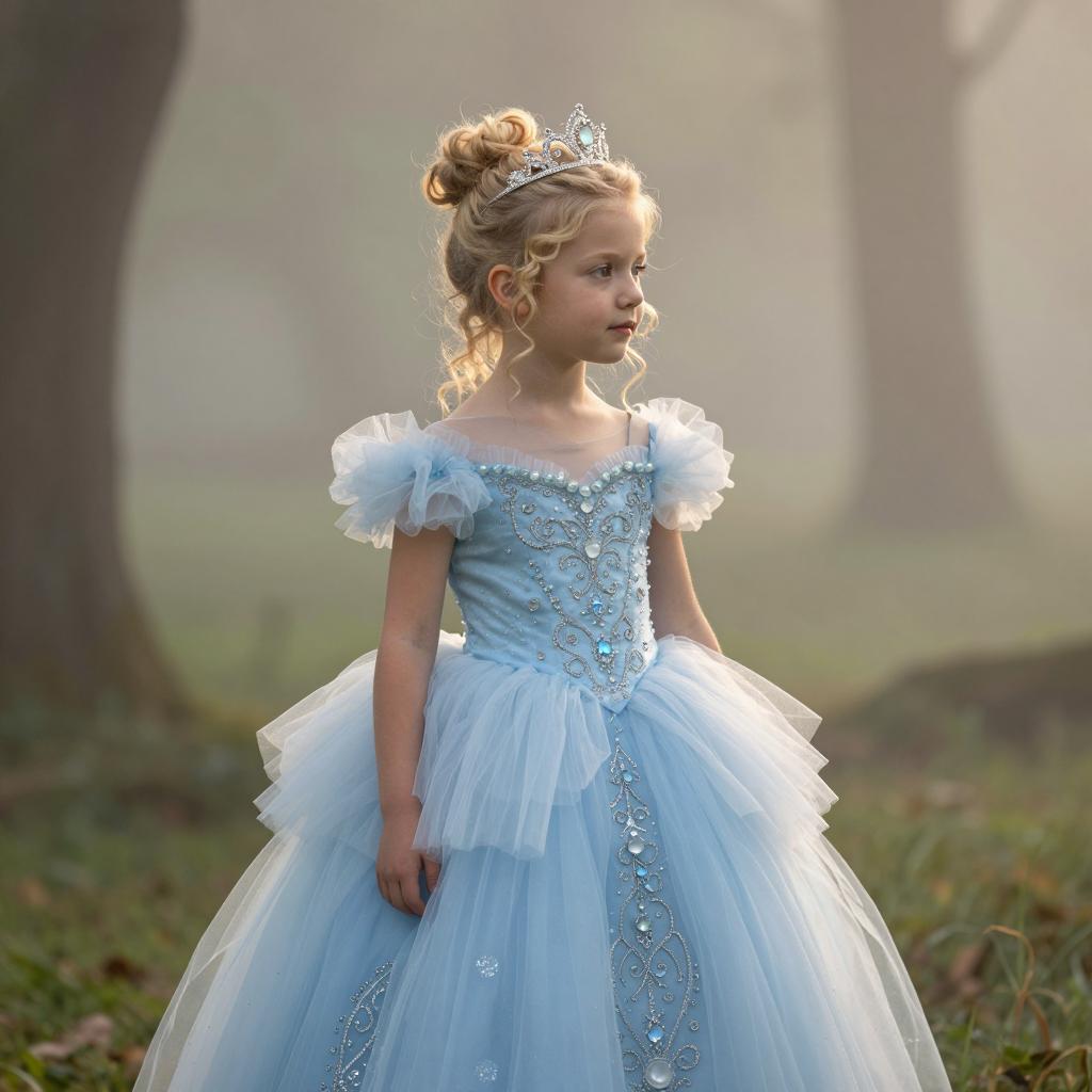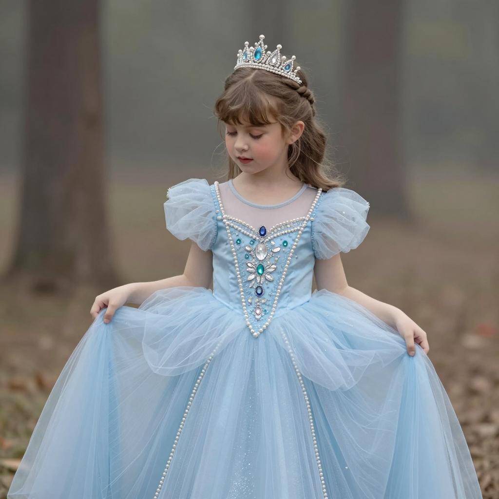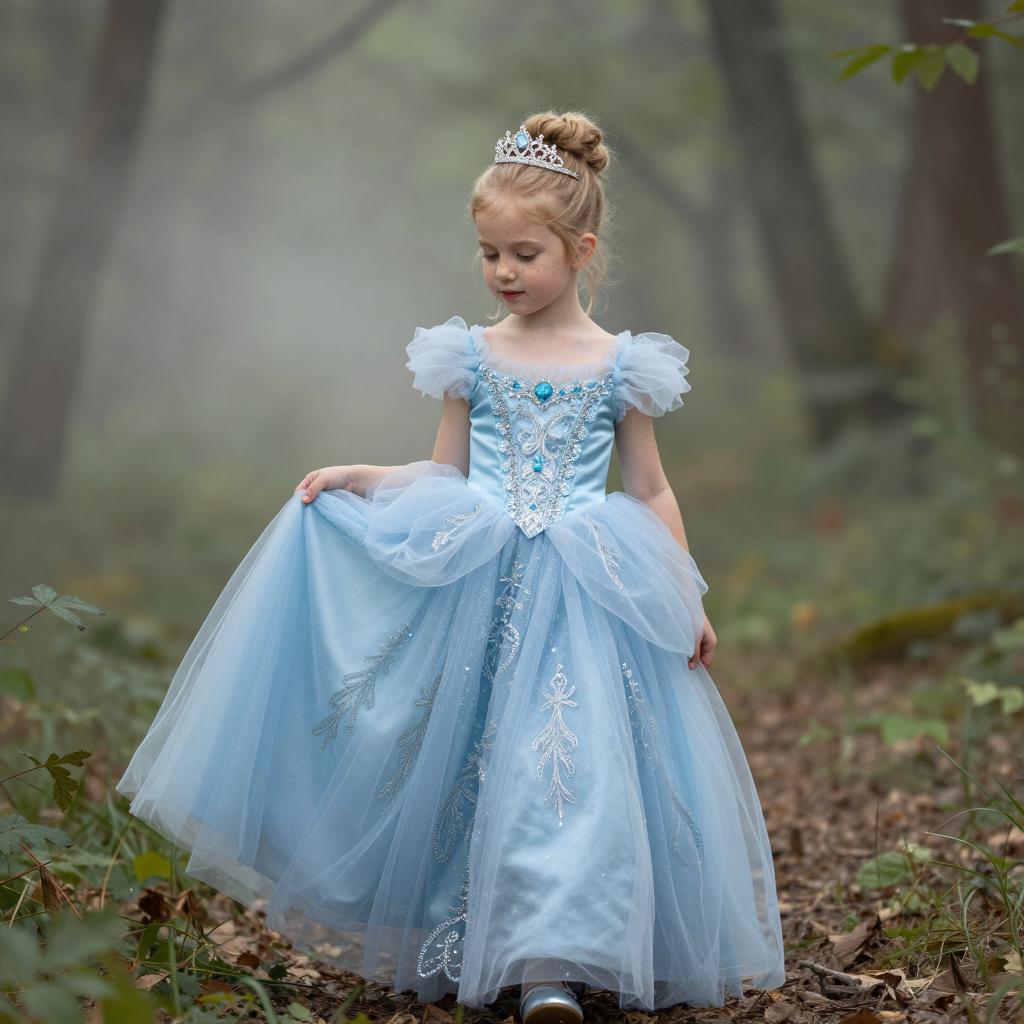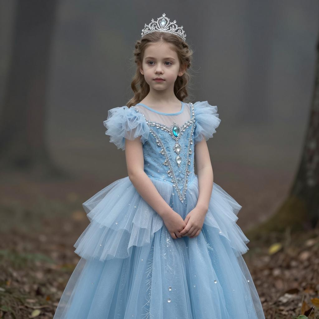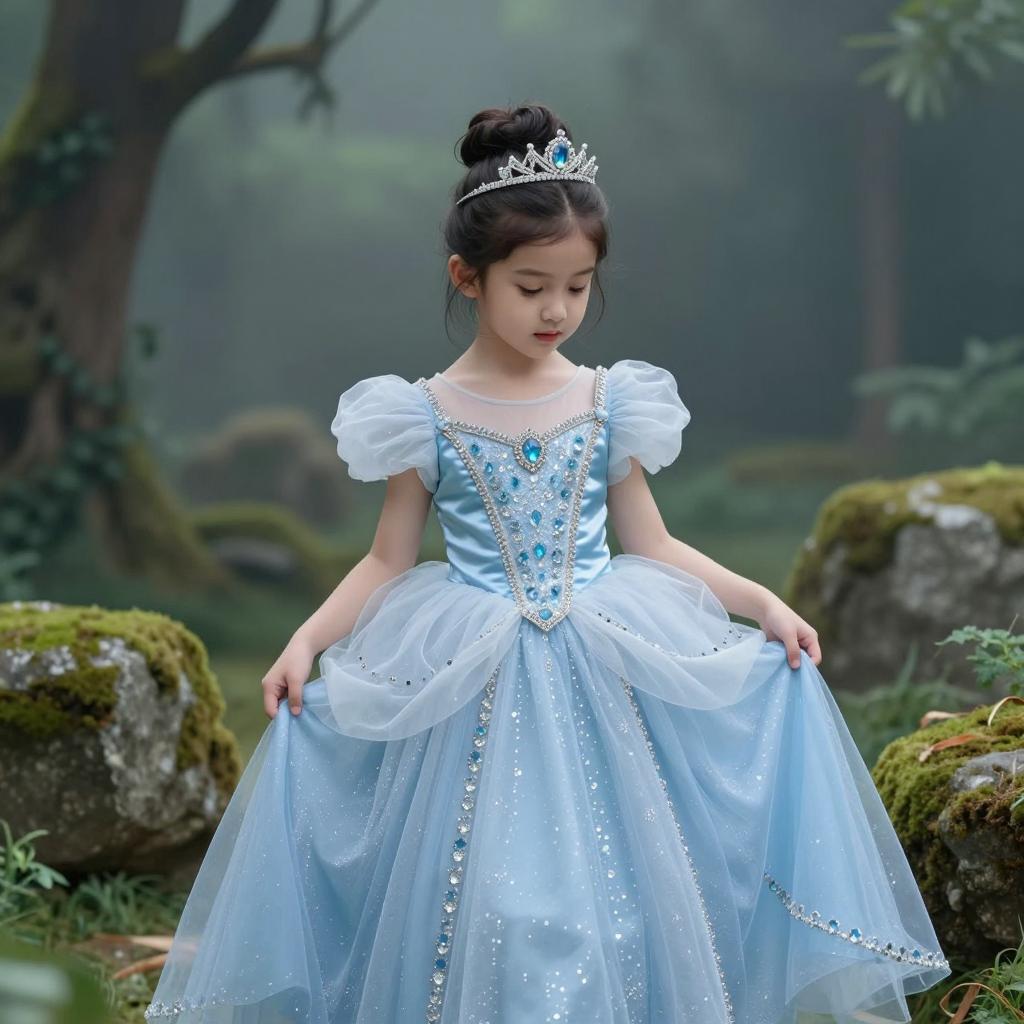 Kids photography, young girl wearing an ice-blue crystal-embellished tulle princess ball gown with puff sleeves, layered skirt and ornate jeweled bodice, plus a delicate silver tiara on her head, in powder blue tulle with white pearls and crystal accents on young girl with neutral skin tone and delicate features, hair up in a bun posed looking down at her gown with a shy, thoughtful gaze, hands brushing the tulle in enchanted grove with moss-covered stones and hazy atmosphere under subtle shafts of light breaking through the forest canopy, dreamy fairytale portrait, high resolution, ultra-detailed, whimsical yet realistic fantasy photography
