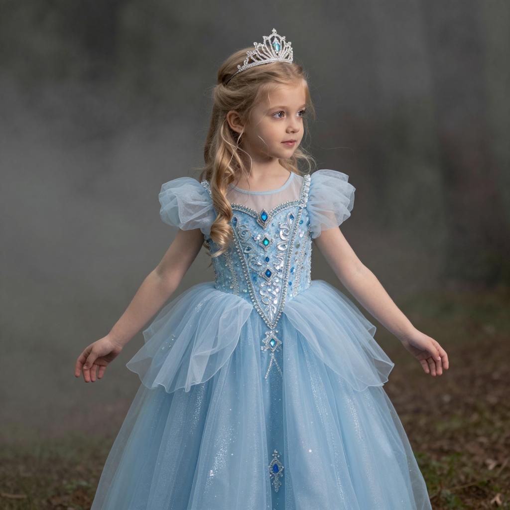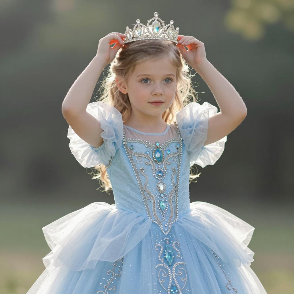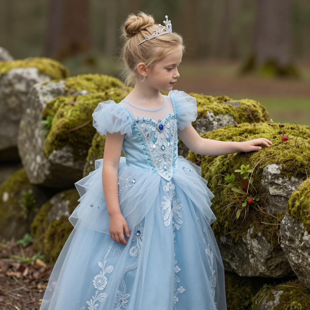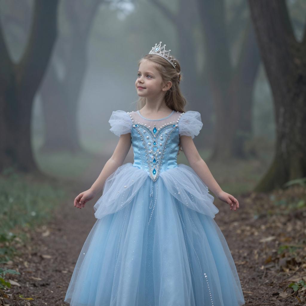 Kids photography, young girl wearing an ice-blue crystal-embellished tulle princess ball gown with puff sleeves, layered skirt and ornate jeweled bodice, plus a delicate silver tiara on her head, in powder blue tulle with white pearls and crystal accents on young girl with neutral skin tone and delicate features, hair up in a bun posed looking down at her gown with a shy, thoughtful gaze, hands brushing the tulle in enchanted grove with moss-covered stones and hazy atmosphere under subtle shafts of light breaking through the forest canopy, dreamy fairytale portrait, high resolution, ultra-detailed, whimsical yet realistic fantasy photography