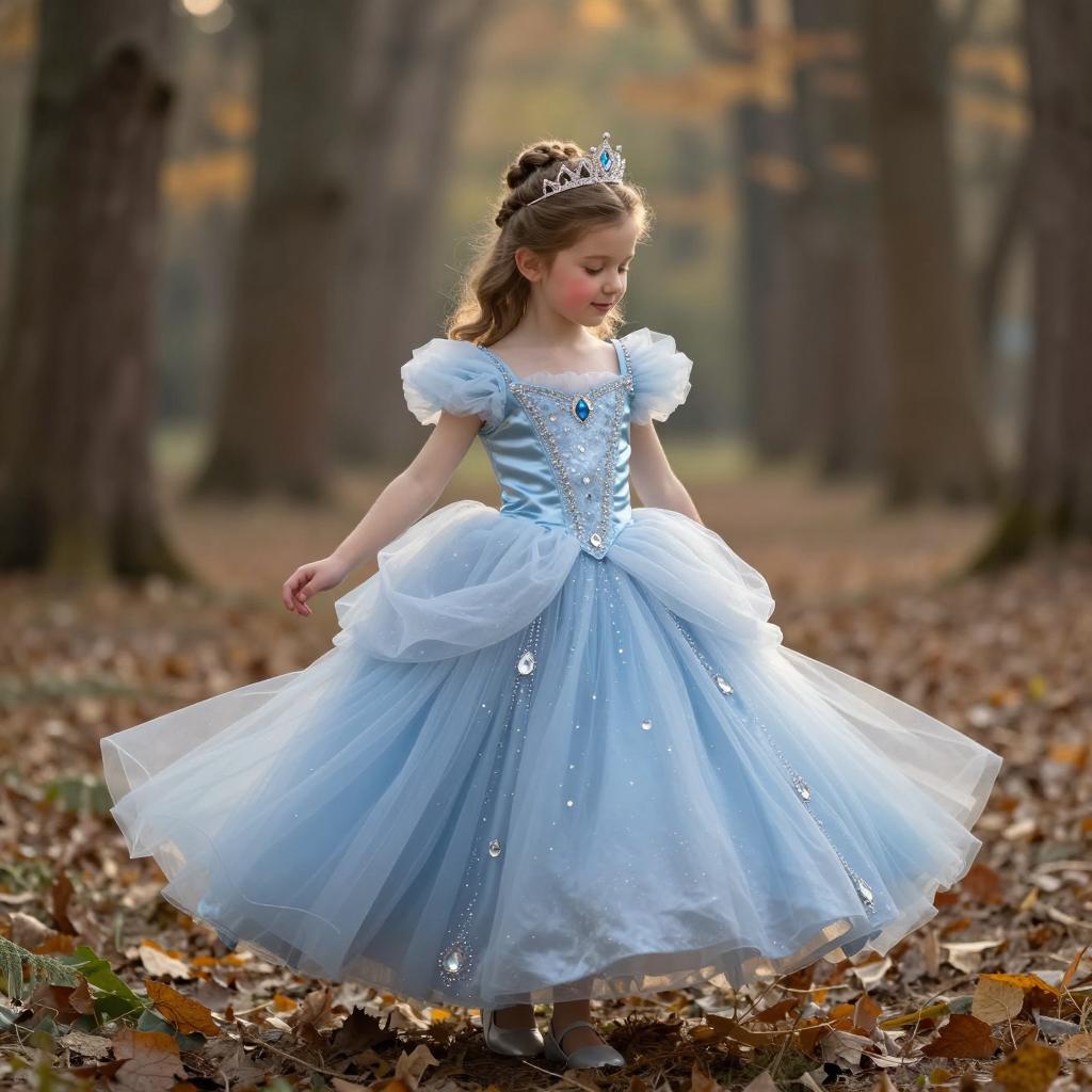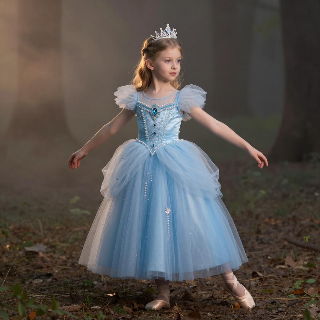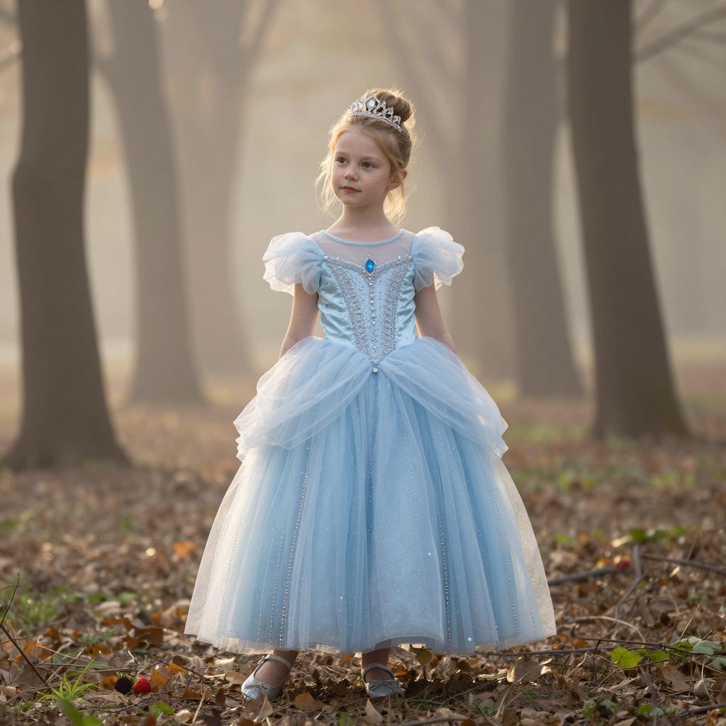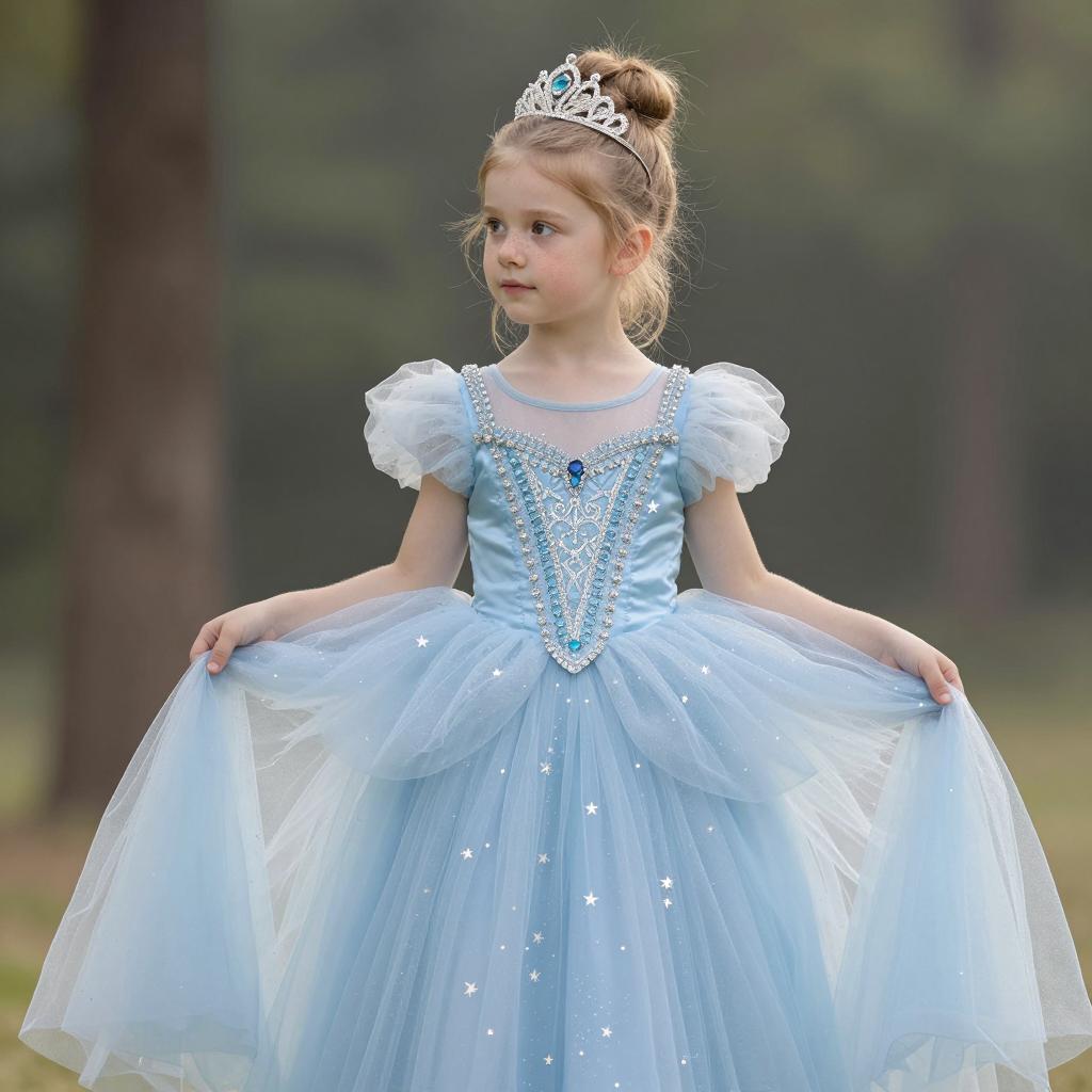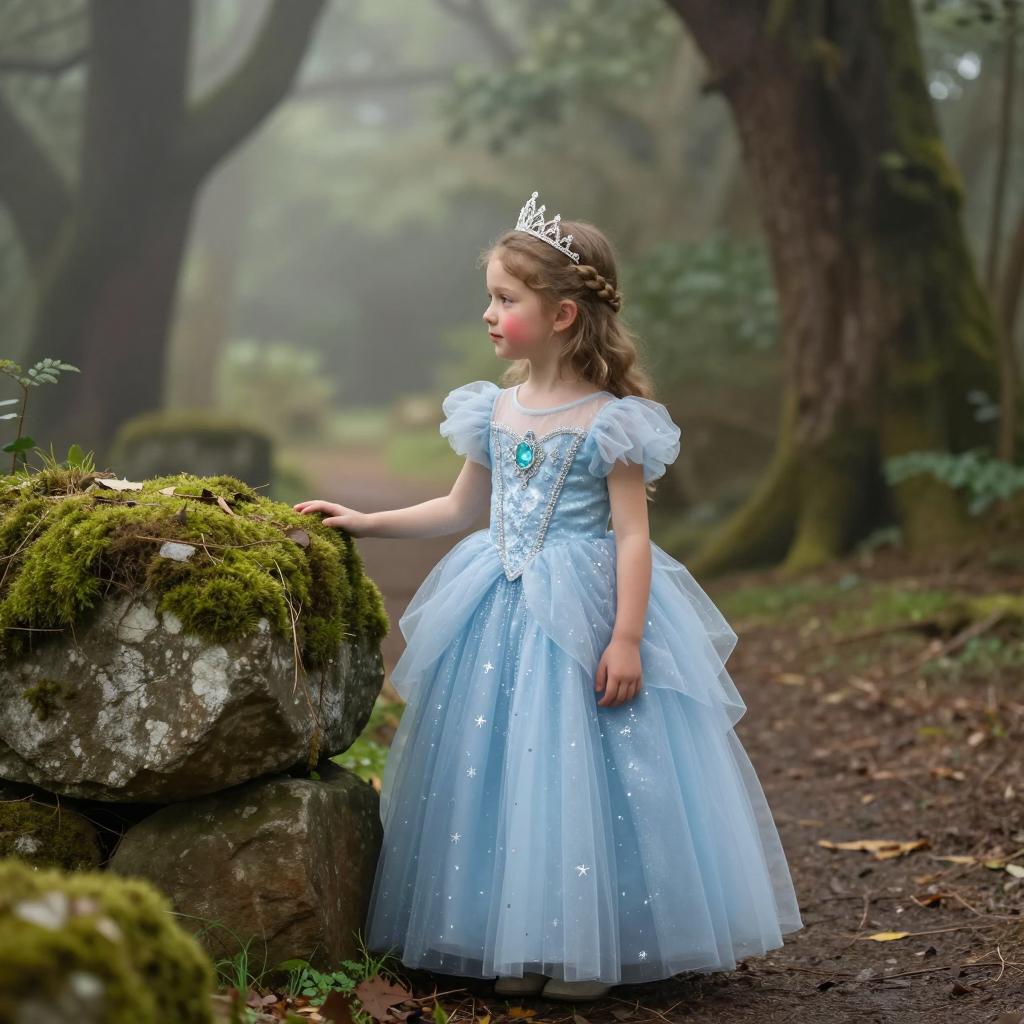 Kids photography, young girl wearing an ice-blue crystal-embellished tulle princess ball gown with puff sleeves, layered skirt and ornate jeweled bodice, plus a delicate silver tiara on her head, in powder blue tulle with white pearls and crystal accents on young girl with neutral skin tone and delicate features, hair up in a bun posed looking down at her gown with a shy, thoughtful gaze, hands brushing the tulle in enchanted grove with moss-covered stones and hazy atmosphere under subtle shafts of light breaking through the forest canopy, dreamy fairytale portrait, high resolution, ultra-detailed, whimsical yet realistic fantasy photography