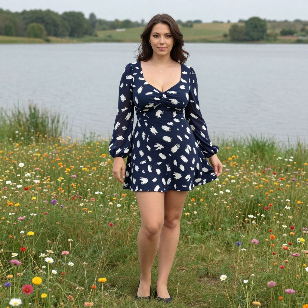A curvy woman in a casual chic A-line mini dress, navy blue with white abstract print, scoop neckline, and long sleeves, stands in a floral meadow beside a tranquil lake, embodying the vibrant visual style of ufotable. She wears simple black flats and minimal jewelry, enjoying the serene surroundings. Sexy. Pretty face and beutiful eyes Sexy. Pretty face and beаutiful eyes. Big breasts