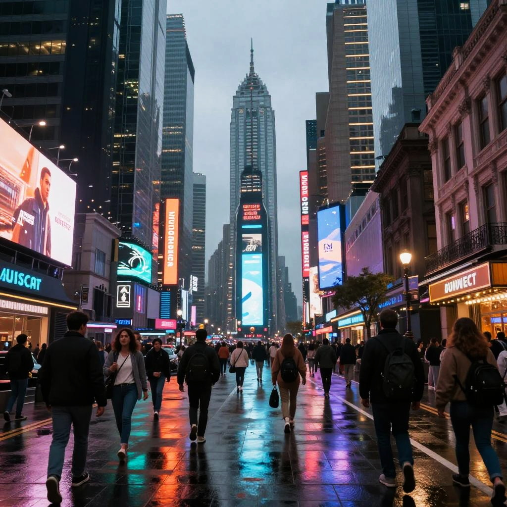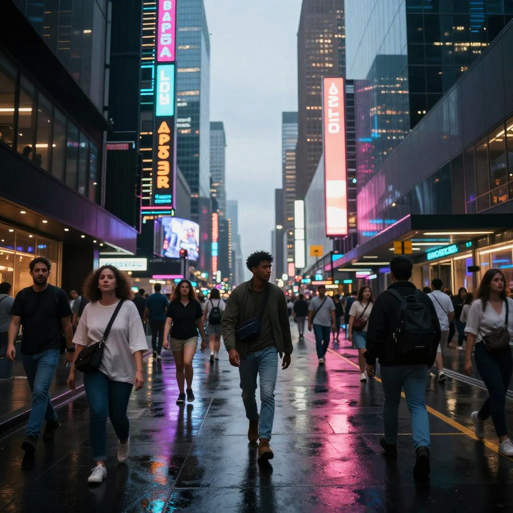 Suituation in a futuristic cityscape at dusk, neon lights reflecting off wet streets, diverse crowd bustling with holographic advertisements, high-tech architecture blending with old buildings, dynamic and vibrant atmosphere, cinematic lighting.