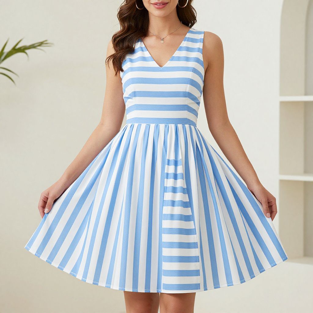 Photograph of a woman in a sleeveless, V-neck, blue-and-white striped dress with a flared skirt, standing in a brightly lit room