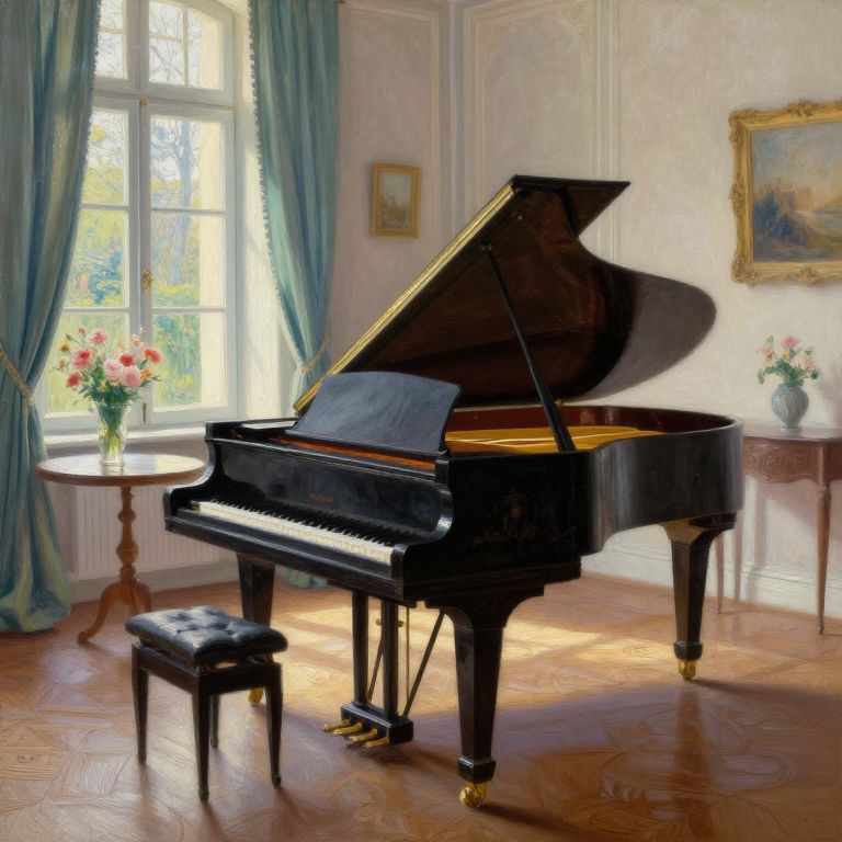 Clasica style painting of a grand piano in an old European salon, sunlight streaming through tall windows, delicate flowers on the table, intricate wooden floorboards, peaceful and timeless ambiance, inspired by impressionist brush strokes.