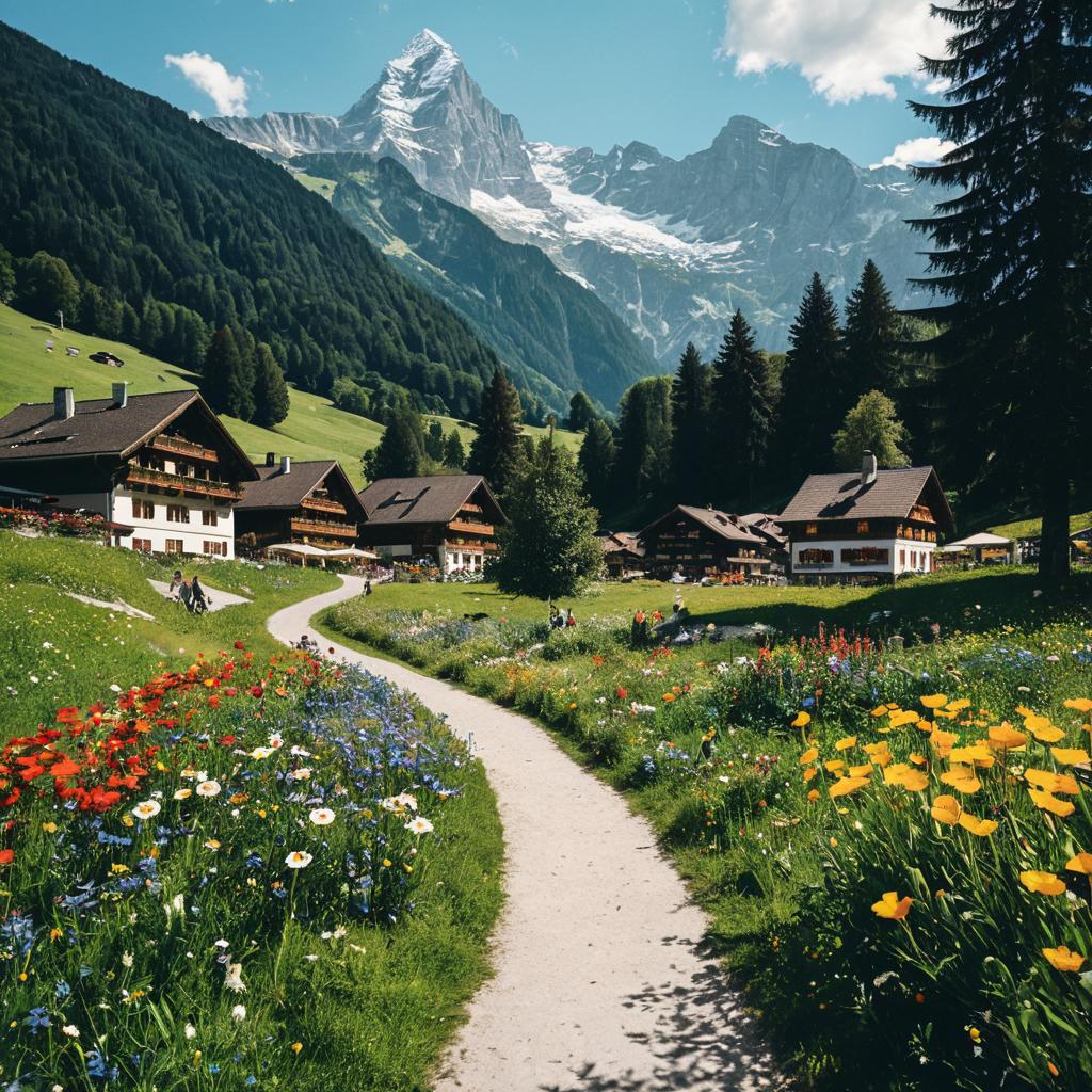 Illustration of a tranquil mountain meadow with lush greenery, oversized flowers, and snow capped peaks. The scene features vibrant colors, Disney-like charm, and a sense of warmth, captured in a pulled-back perspective for an immersive, wonder-filled composition.