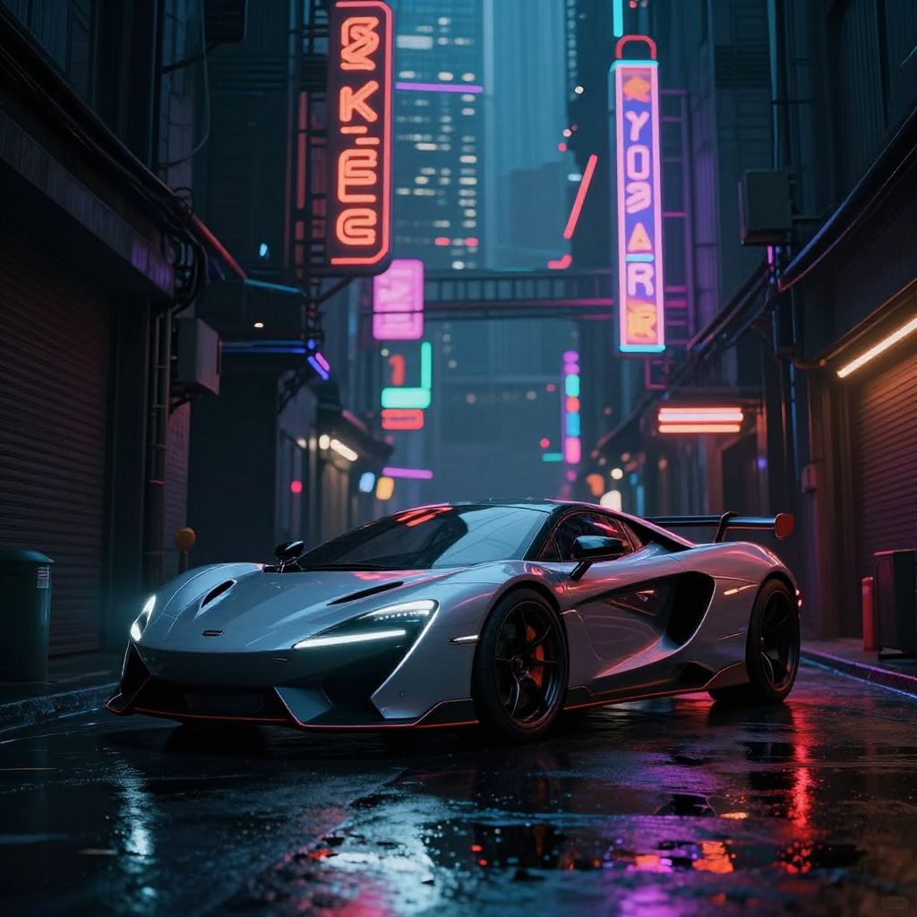 Photorealistic CGI: sleek silver sports car with glowing headlights on a neon-lit, rain-soaked urban alley at night, surrounded by vibrant,