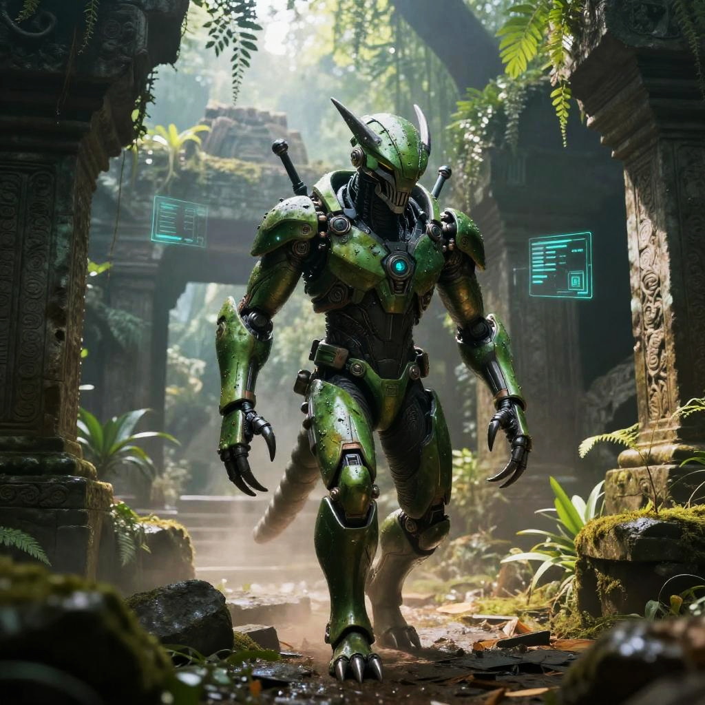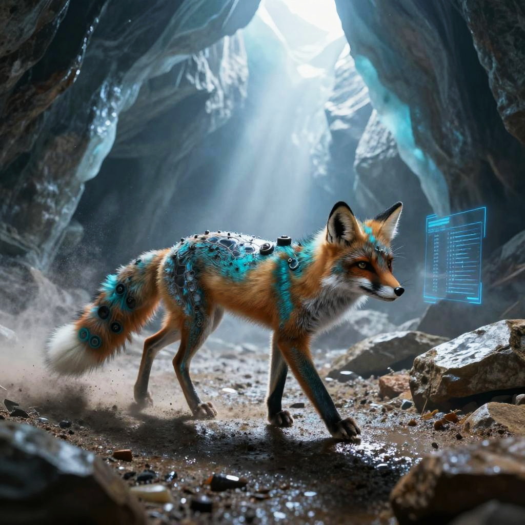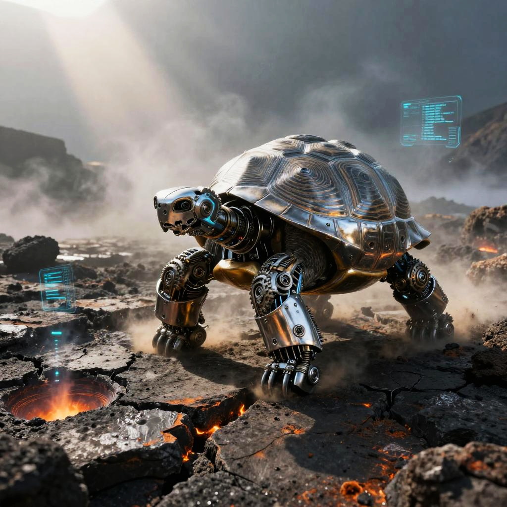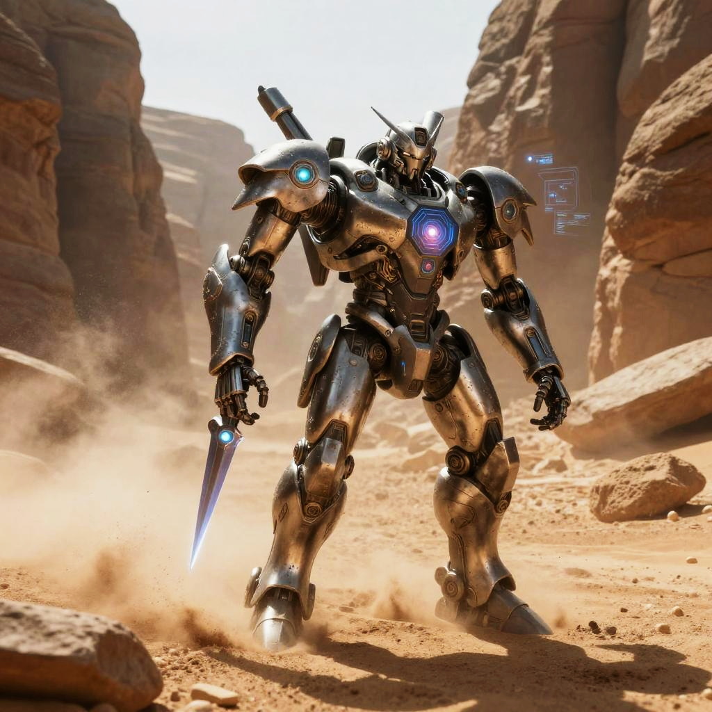 Bronze plated armadillo automaton with interlocking segmented armor, rotating auditory sensor bells, dust repellent plating traverses rusting scrapyard on a barren desert plateau. Cinematic lighting, volumetric fog, god rays through dust, subsurface scattering on fur, reflective metal wear, oxidized stone, holographic HUD glints, atmospheric perspective, wet textures and micro-scratches, high contrast grading, shallow depth of field, wide composition, film grain, subtle bloom, photoreal 8k, epic yet mysterious mood.