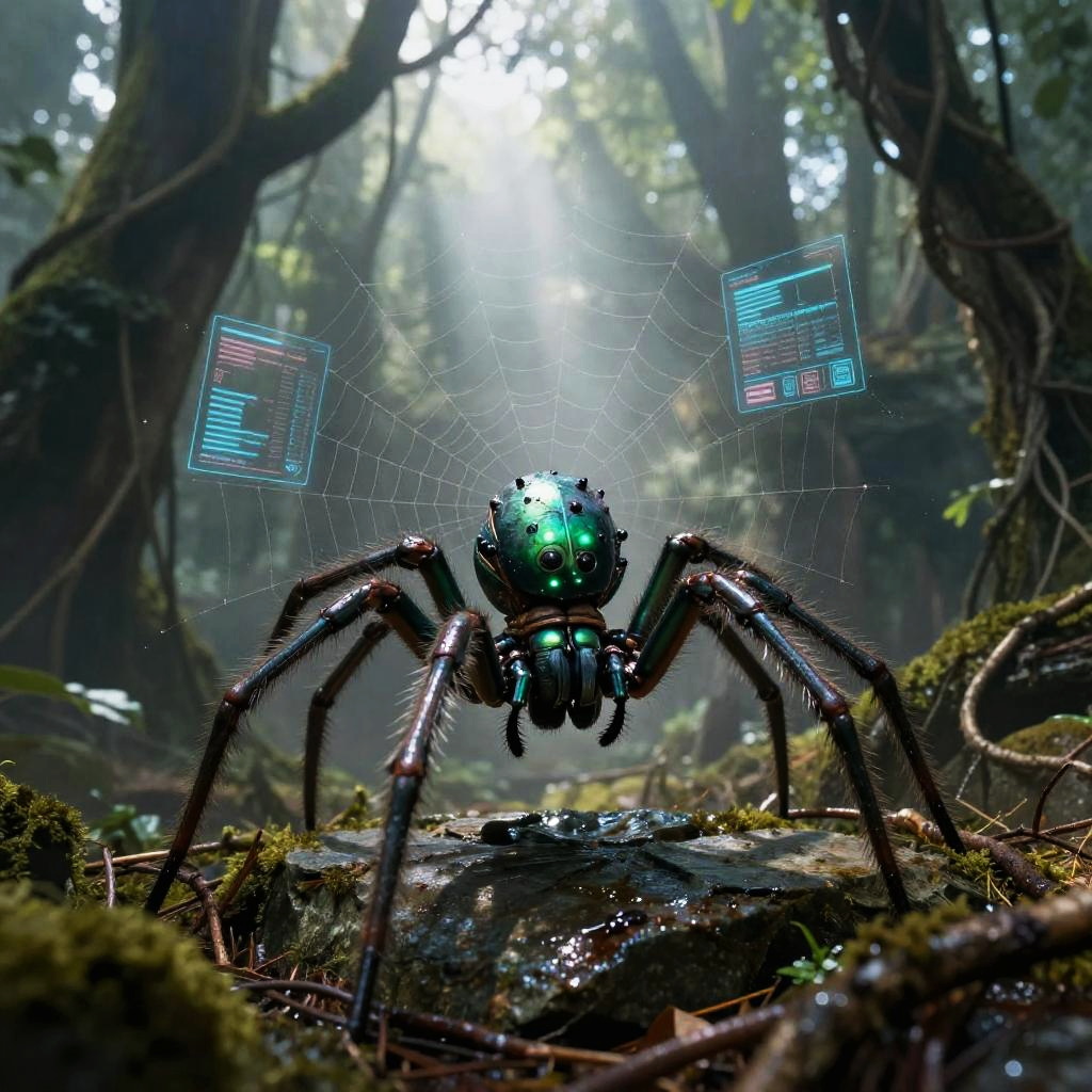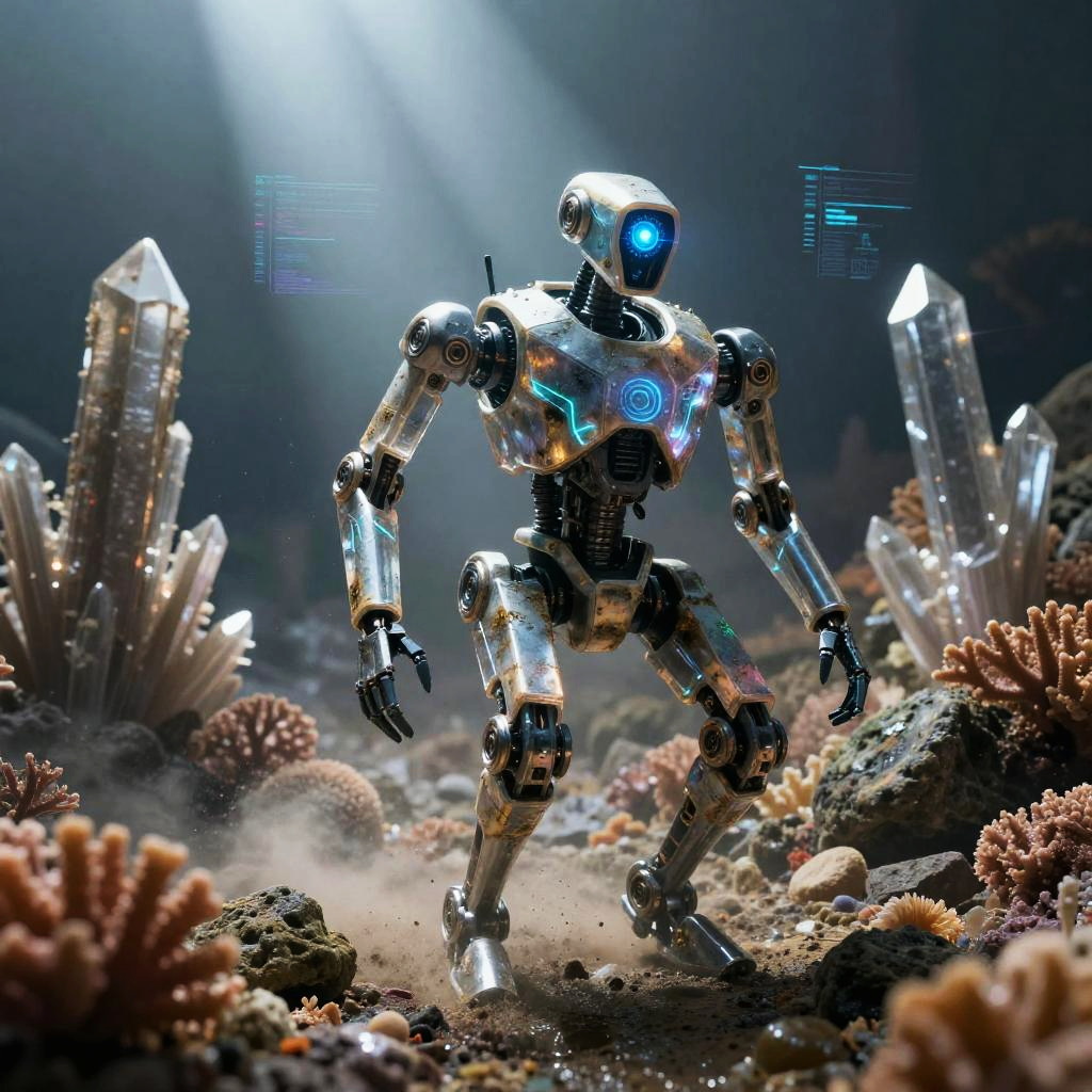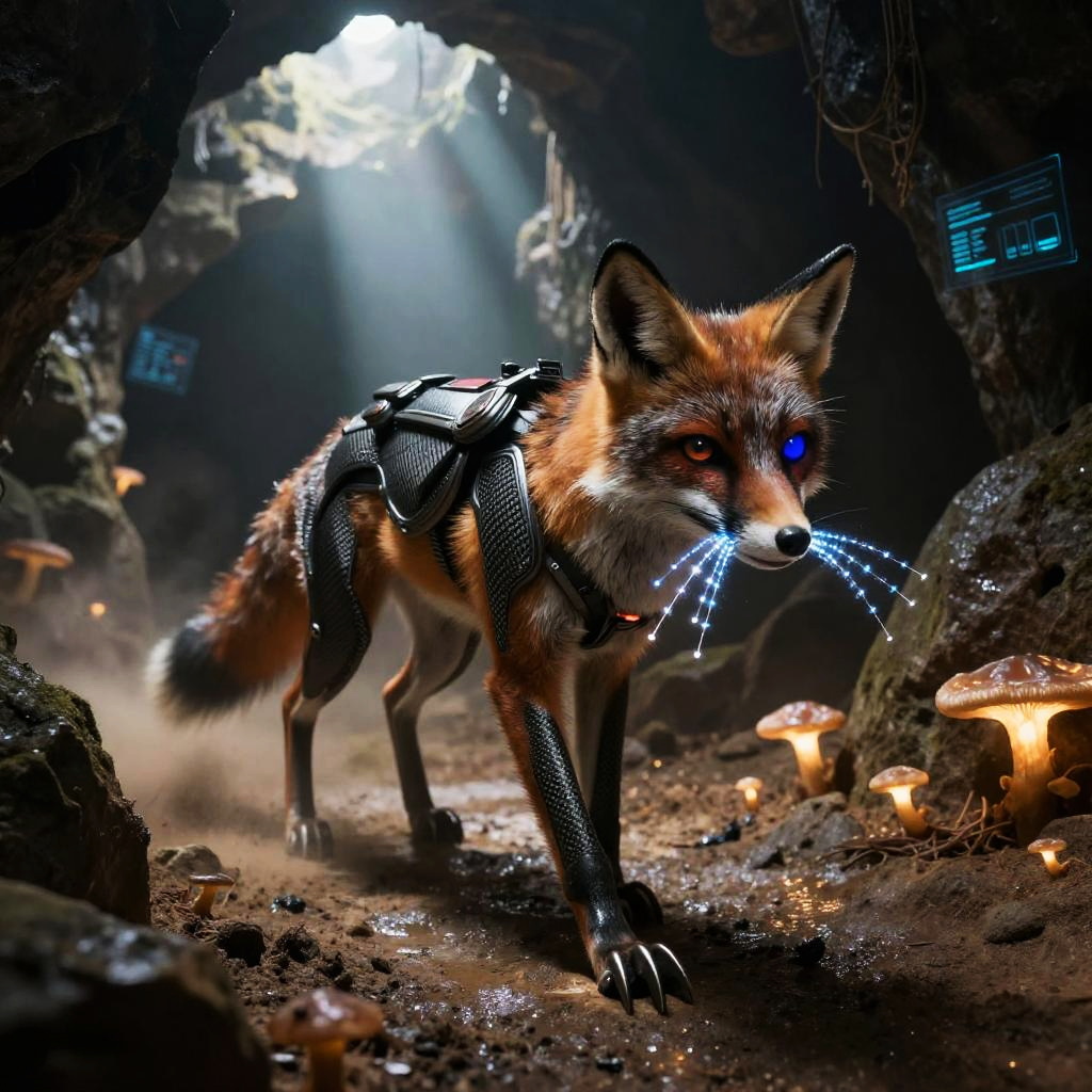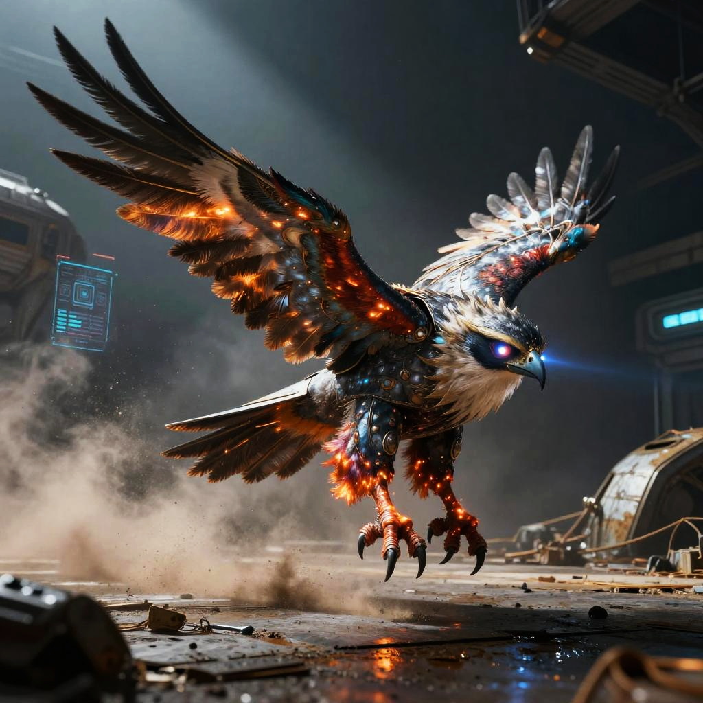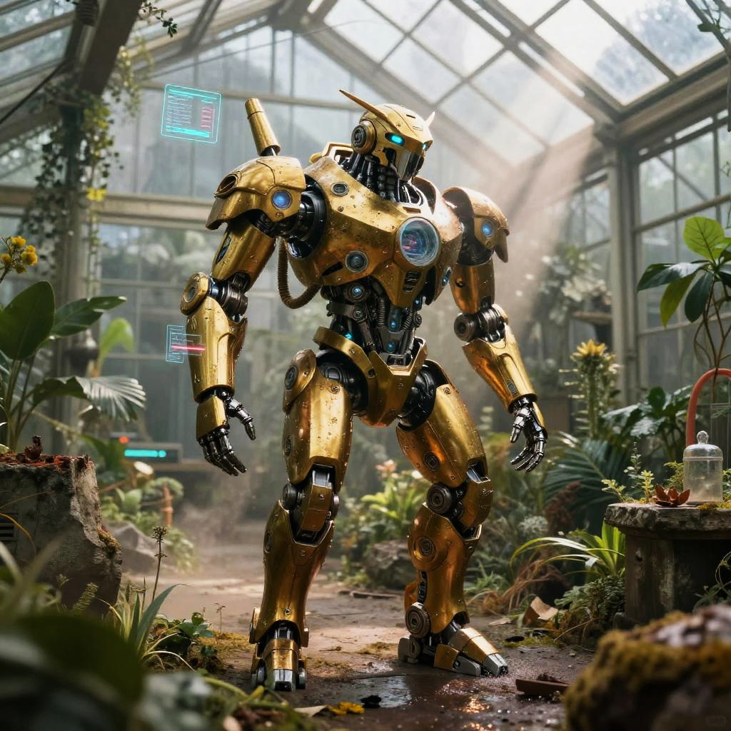 Bronze plated armadillo automaton with interlocking segmented armor, rotating auditory sensor bells, dust repellent plating traverses rusting scrapyard on a barren desert plateau. Cinematic lighting, volumetric fog, god rays through dust, subsurface scattering on fur, reflective metal wear, oxidized stone, holographic HUD glints, atmospheric perspective, wet textures and micro-scratches, high contrast grading, shallow depth of field, wide composition, film grain, subtle bloom, photoreal 8k, epic yet mysterious mood.