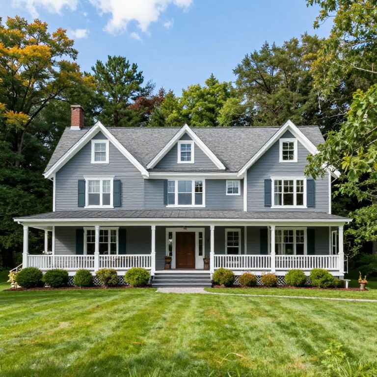 Front view of a large historic mountain home located at 635 County Route 47, Saranac Lake, New York. The two-story house features a gray exterior with white trim, multiple gables, a full front porch with white railings, and a well-maintained green lawn surrounded by trees.