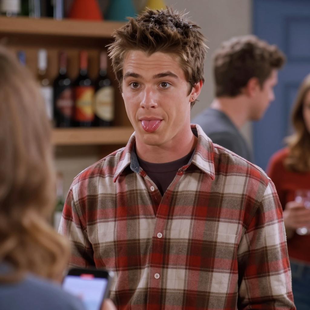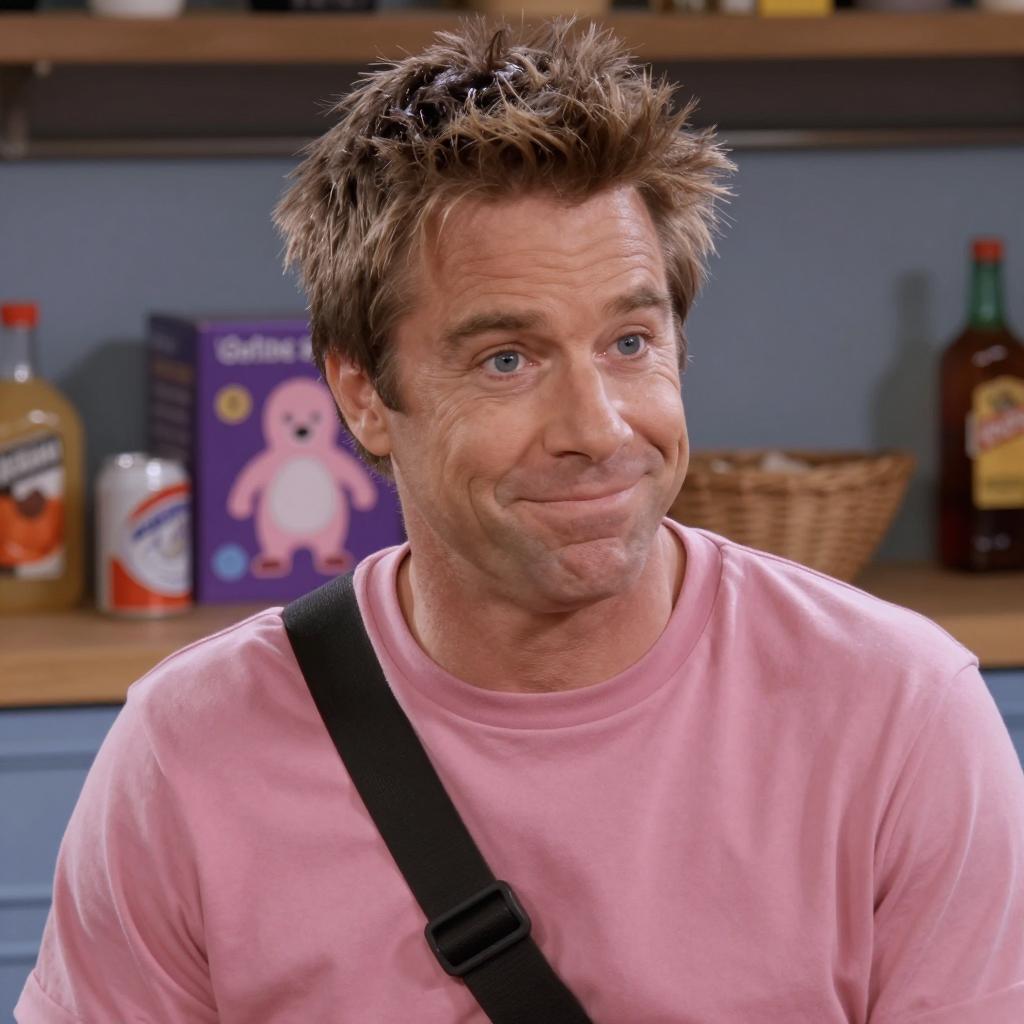 Photograph of a middle-aged man with short, light brown hair and blue eyes, smiling slightly. He wears a pink shirt with a black strap across his shoulder. Background includes a cluttered kitchen counter with groceries, a purple box with a pink character, a can, and a bottle. Soft lighting.