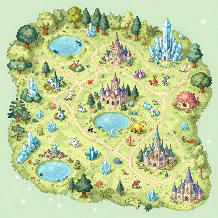 Colorful fantasy map of a magical kingdom with crystal caves, multiple castles, winding paths, lakes, trees, and whimsical creatures.