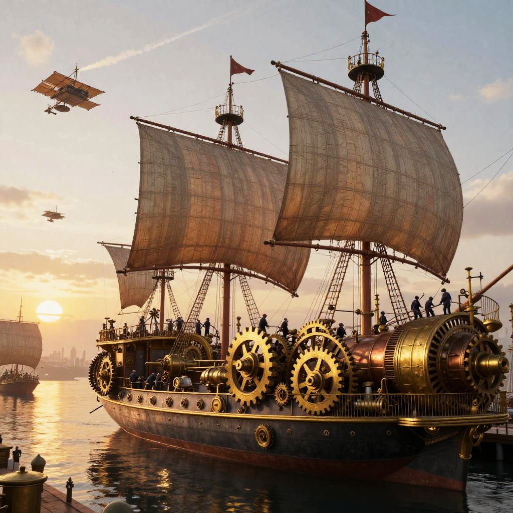 Midths, detailed steampunk airship docked in a vast harbor, brass and copper machinery gleaming under a golden sunset, crew working on intricate gears, large wooden sails unfurled, sky filled with vintage flying machines and smoke trails