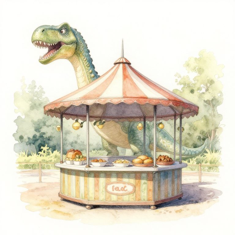 Whimsical watercolor illustration of a friendly green dinosaur operating a food cart with pastries, under a red-striped canopy, in a sunny park.