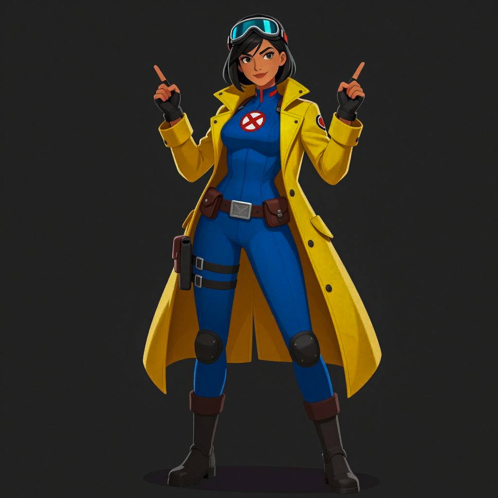 Illustration of a determined young woman with short brown hair wearing goggles on her forehead, a brown puffer vest over a blue shirt, and blue jeans. She holds a flashlight in her right hand and points upwards with her left hand. The character stands inside a glowing circular frame with dynamic blue lighting and lightning bolts. The background features a gradient from blue to pink, emphasizing a bold, adventurous mood.