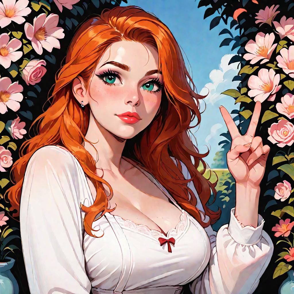 This is a vibrant, digital anime-style illustration of a redheaded woman with long, wavy hair and striking green eyes. She is making a peace sign with her right hand and has a slight, confident smile. She wears a white, low-cut blouse with a red bow at the center, accentuating her large breasts. The background features a vivid blue sky with white clouds and is framed by lush pink and white flowers with dark green leaves. Her fair skin is adorned with subtle blush and she has pink lipstick. The overall style is bright and colorful, with a focus on her expressive face and detailed hair.