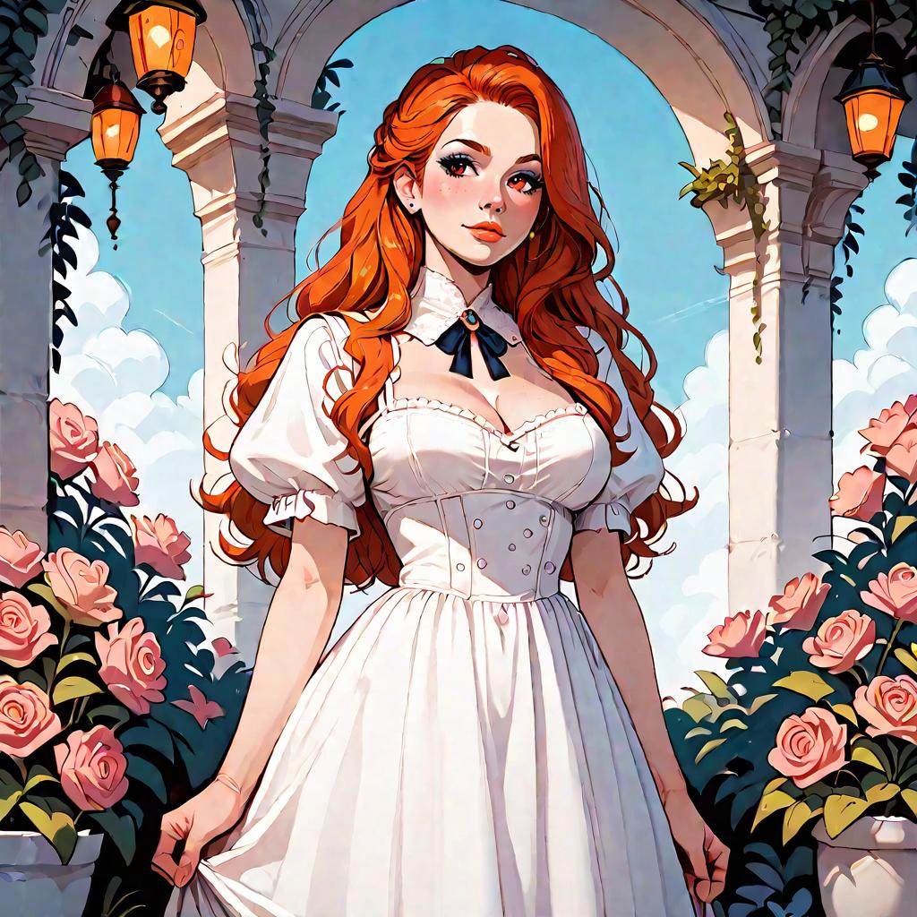 Score_9, score_8_up, score_7_up, score_6_up, score_5_up, score_4_up, cute, ginger hair, blush, curvy, large breasts, long hair, v10l3t, garden, dress