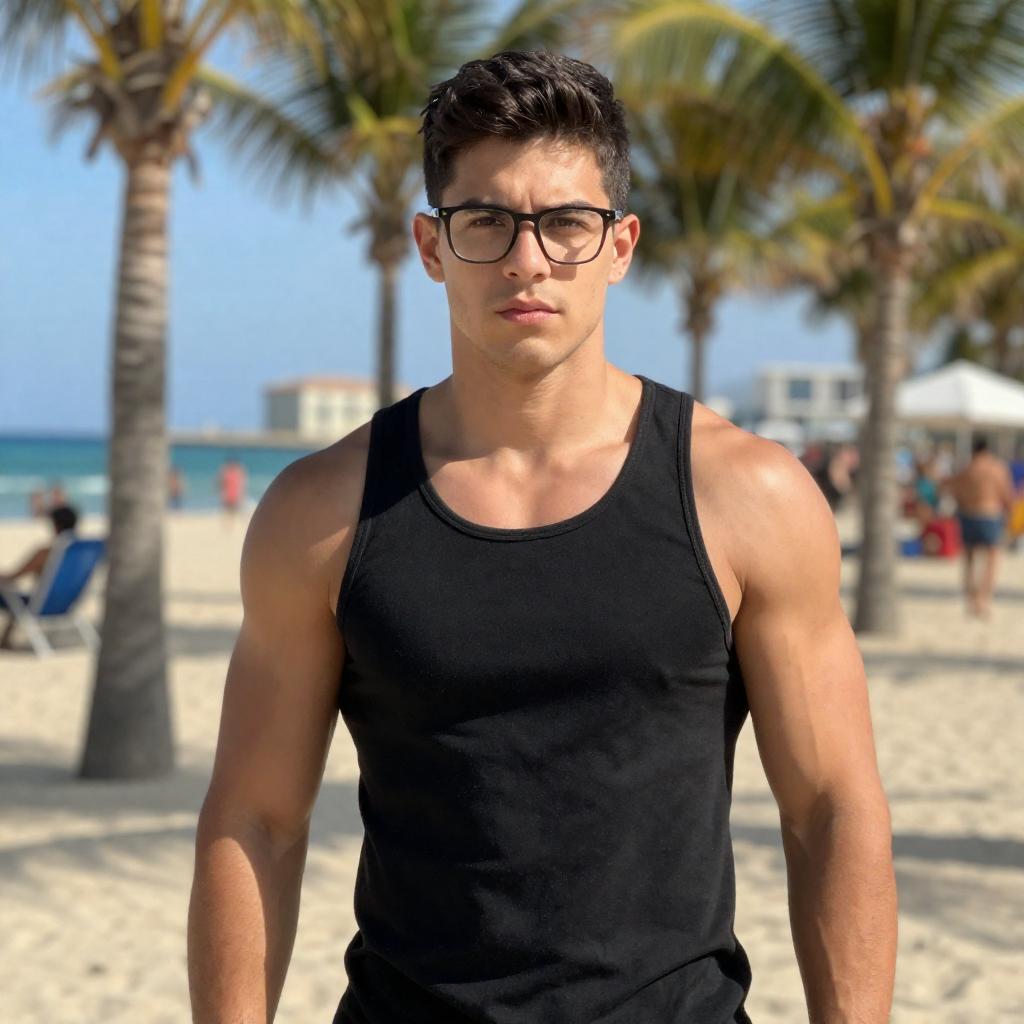 Photograph of a muscular, young man with short dark hair and glasses, wearing a black tank top, standing in a sunny beach setting. Palm trees and a blurred background with people and beach chairs are visible. He has a serious expression and is centered in the frame.