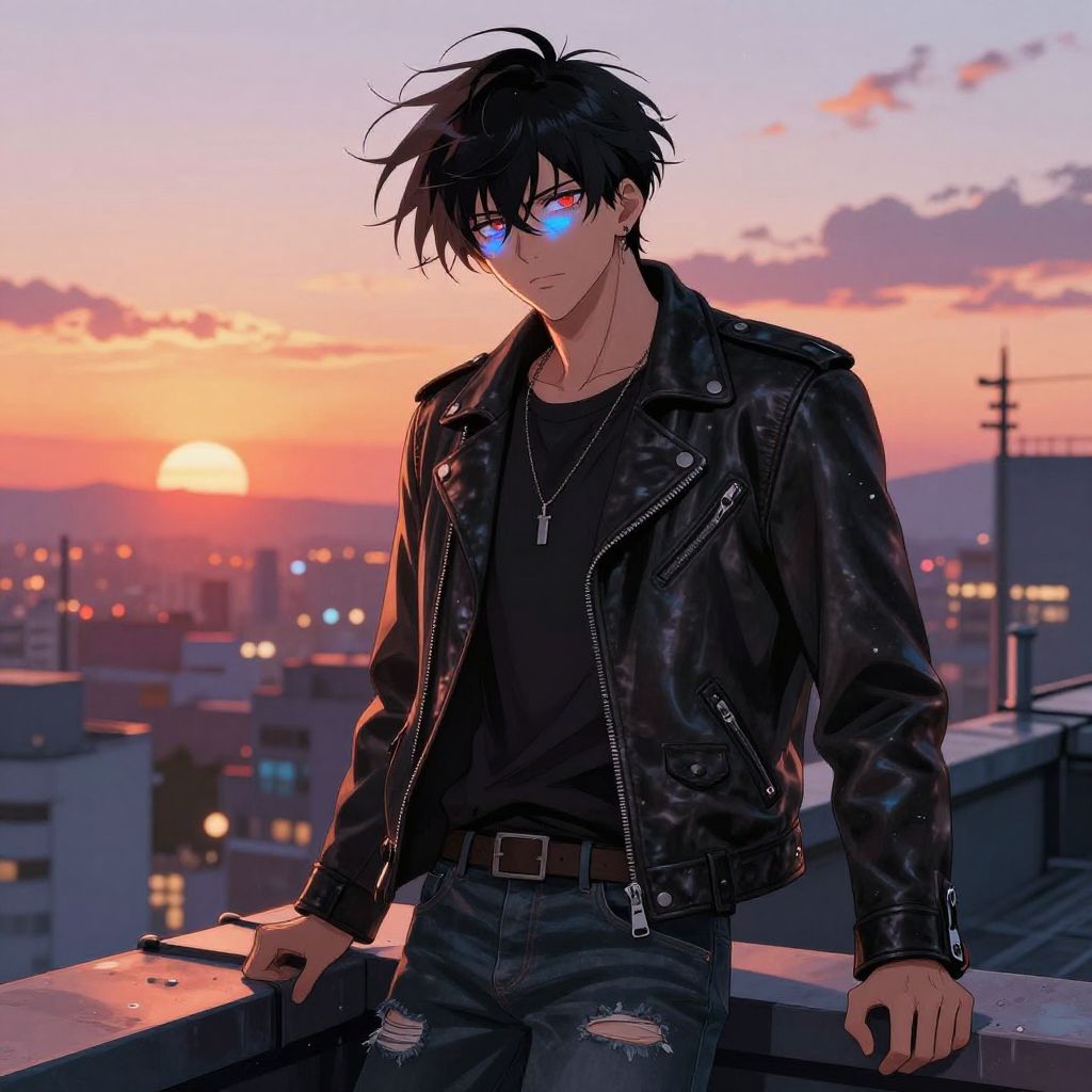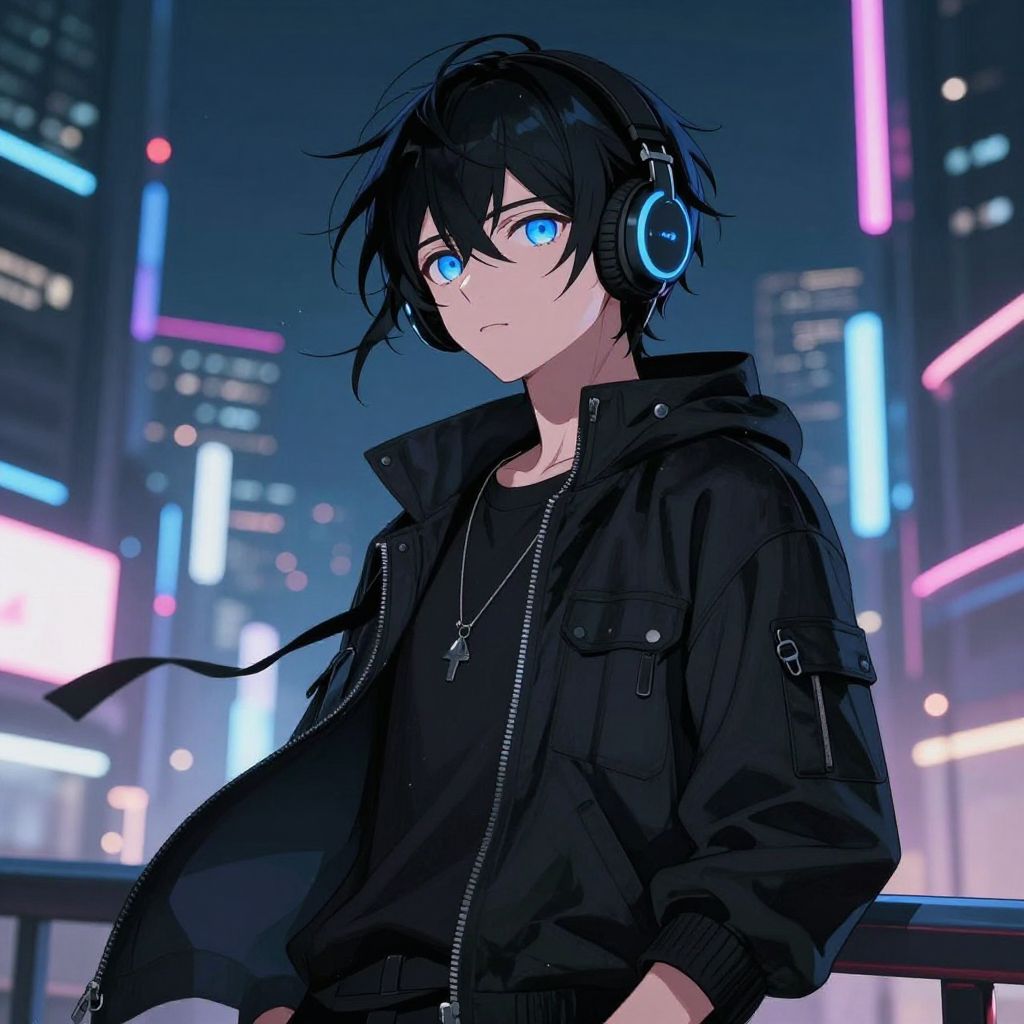 Hot anime guy with black hair in a futuristic cyberpunk setting, glowing blue eyes, sleek black outfit with metallic accents, rain pouring down, cityscape full of holograms and neon signs in background, intense and mysterious expression, high detail anime art.