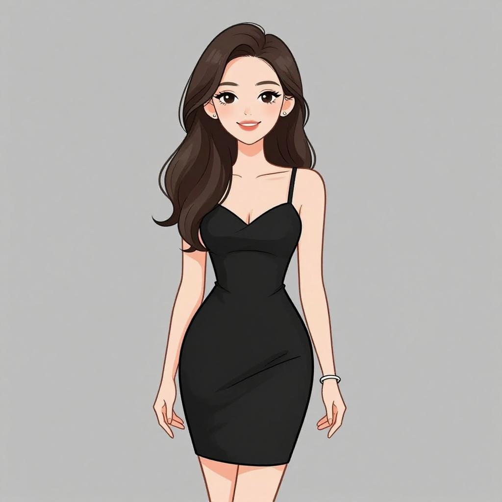 Woman with pretty face and pretty hair. smiling Woman, chic, black cocktail dress with a plunging neckline, thin spaghetti straps, form-fitting silhouette, above-the-knee length, minimalistic bangle on one wrist. --sref 1467