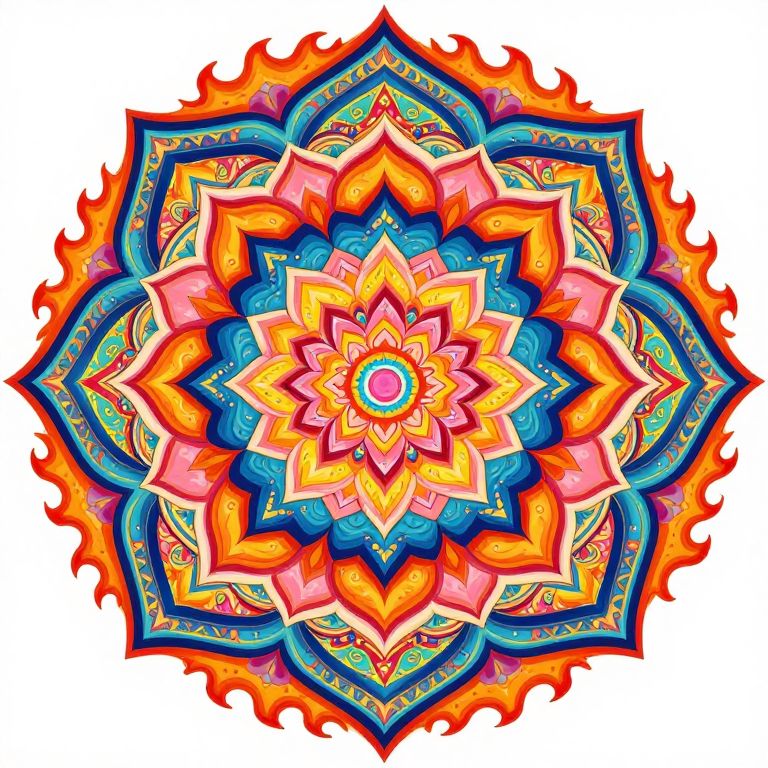 A vibrant, symmetrical mandala featuring a lotus flower, flame, and intricate patterns inspired by Tibetan mysticism, psychedelic art, and advanced civilizations.