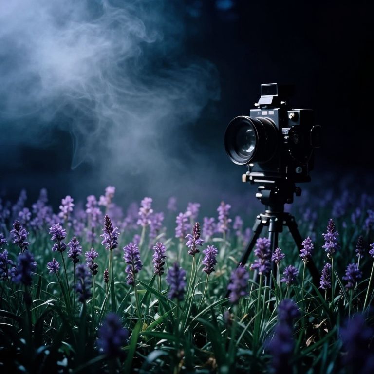Film Art a field of purple flowers in a dark room filled by smoke, light mysterious illustrates, 35mm lens,
