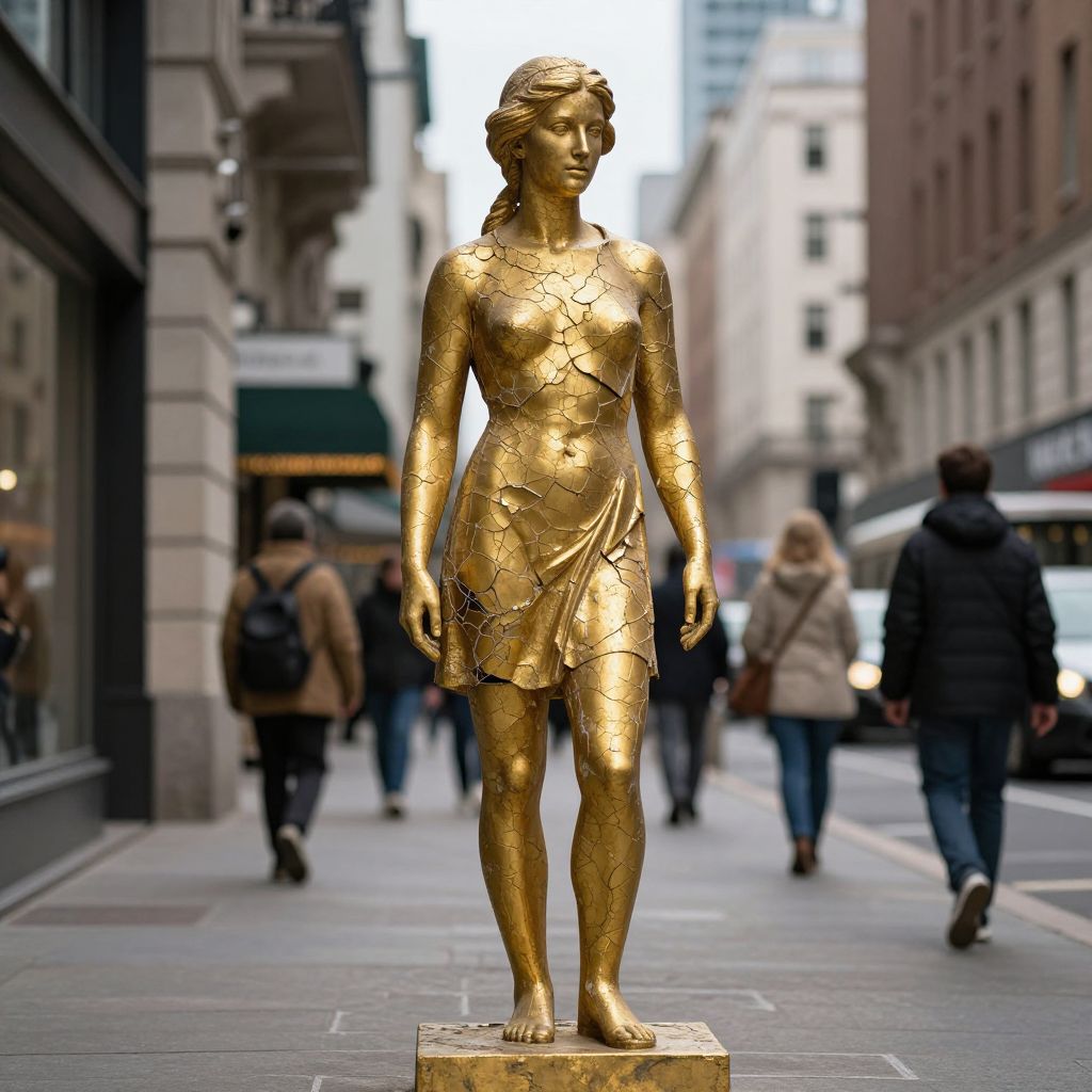 Photograph of a golden, cracked statue of a woman in a short dress, standing on a city sidewalk with blurred pedestrians in the background.