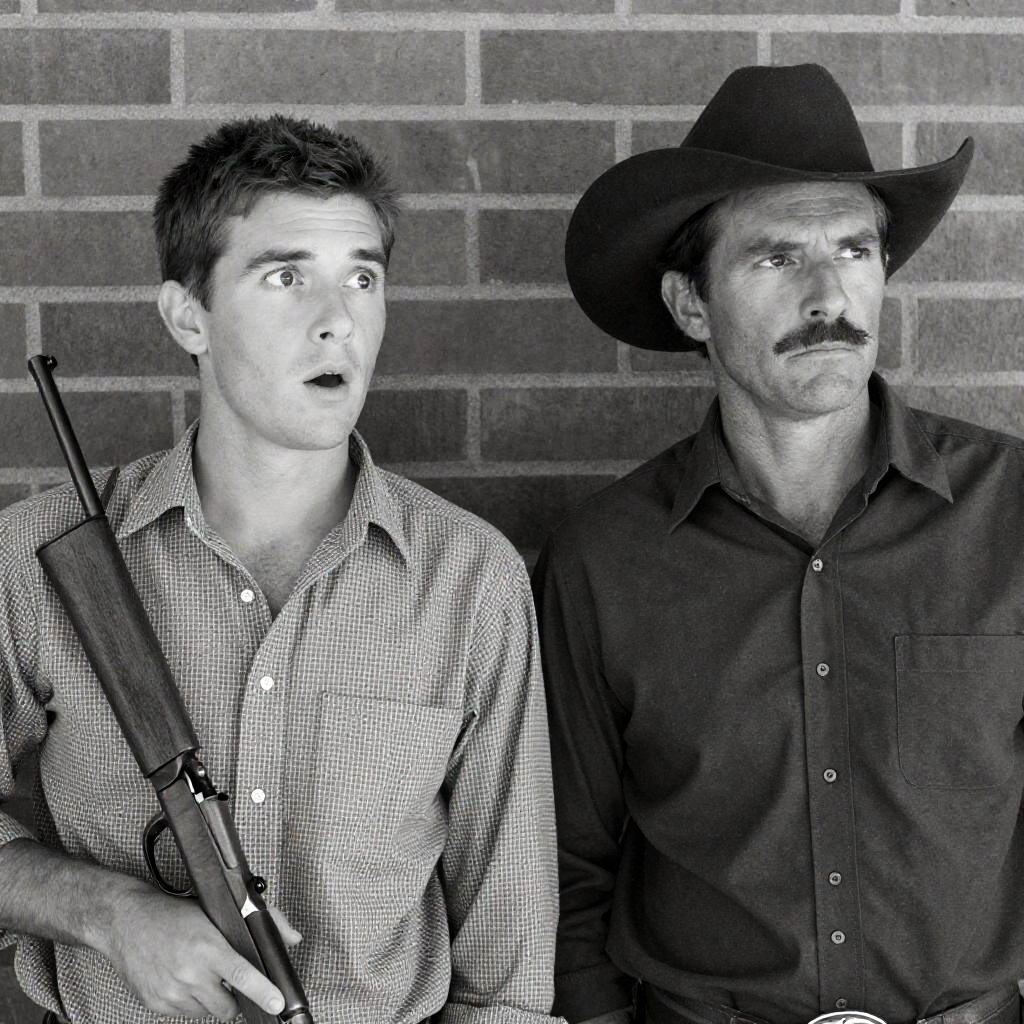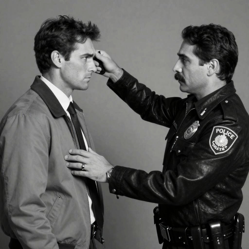 Black and white photograph of two men. Policeman with dark leather jacket, badge, and gun points at man with hands on head. Policeman has mustache, medium-length dark hair. Man in light jacket and tie looks tense. Indoor setting. Policeman's arm extended, gun in right hand, left hand on other man's chest.