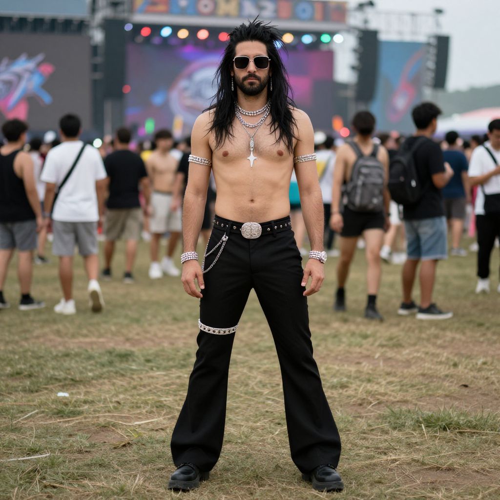 Rave dudes costume, 1boy, male focus, solo, beard, facial hair, black hair, long hair, sunglasses, full body, shoes, standing, jewelry, pants, messy hair