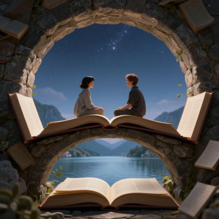 Two dreamers sit atop a stone archway adorned with open books, their pages forming a magical bridge that overlooks a serene lake and distant mountains, as they gaze at each other under a starlit sky.