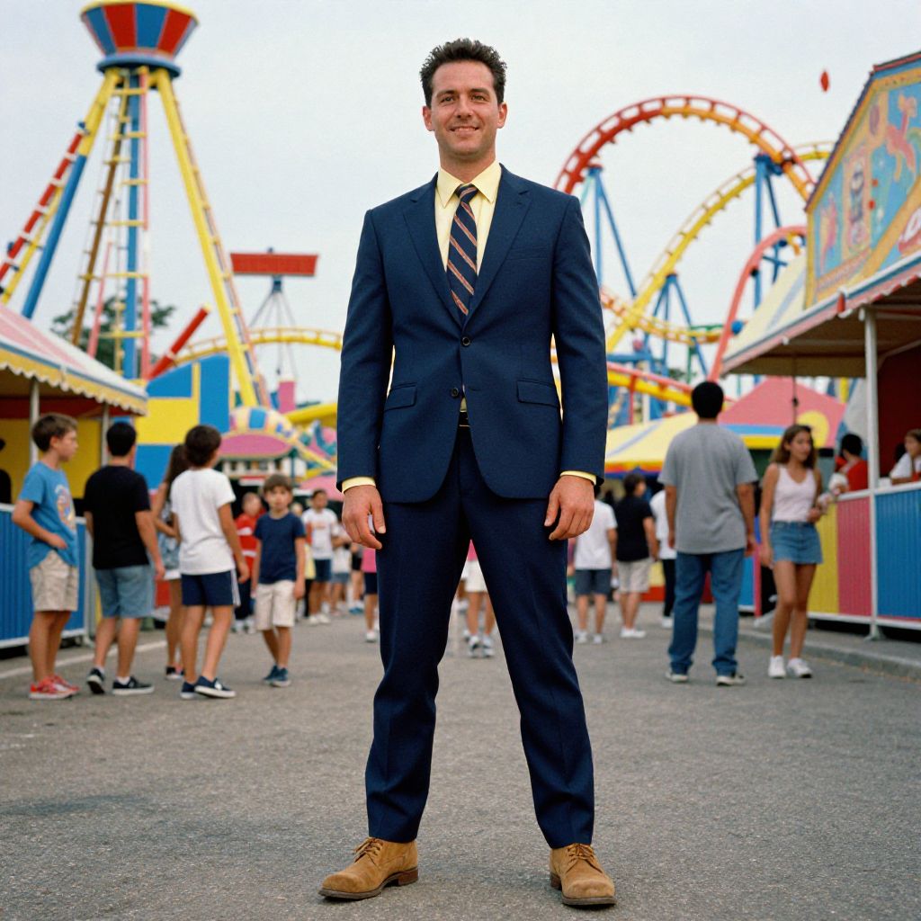 Photograph of a smiling man in a navy suit, striped tie, and brown boots standing in a colorful, busy amusement park.