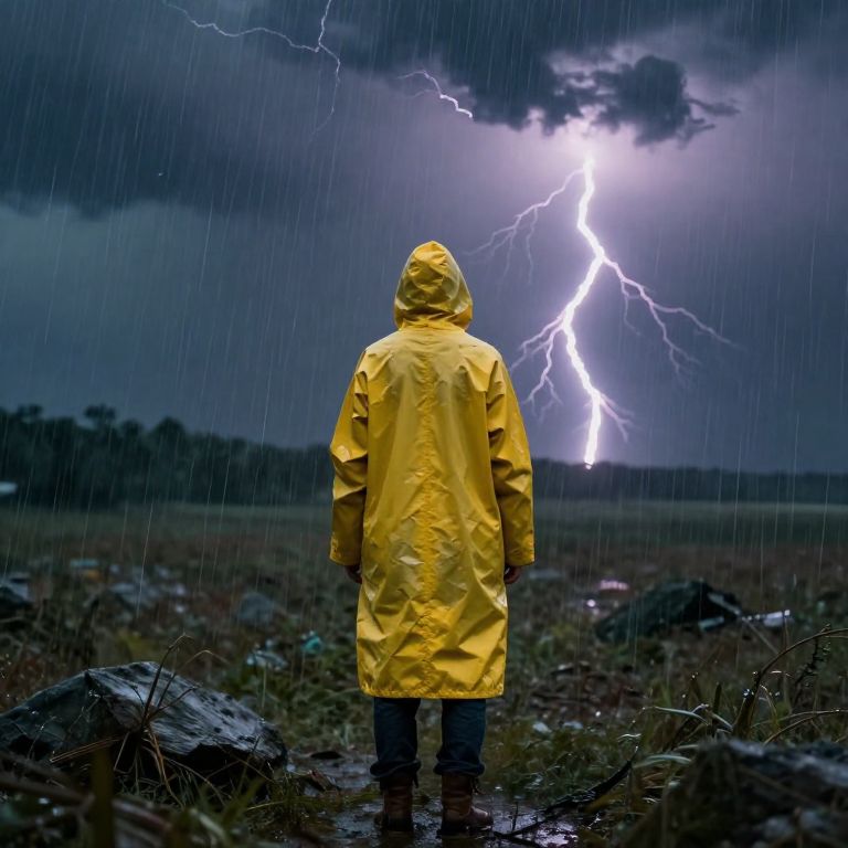 A person in a yellow raincoat stands in a stormy, lightning-filled landscape, with dramatic lighting and a moody atmosphere.
