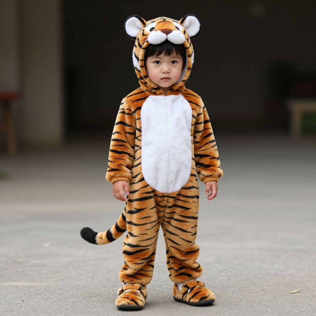 "tiger toddler costume, solo, male focus, 1boy, tiger print, animal costume, shoes, animal print, full body, black hair, tail, child, looking at viewer, standing, cosplay Realistic photo of casual sexy person with pretty face"