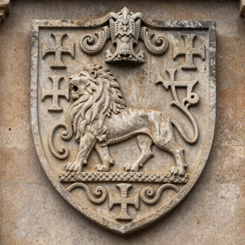 Lion family crest displayed on a textured stone shield, weathered medieval design, roaring lion centerpiece surrounded by medieval symbols and scrollwork, earthy natural tones