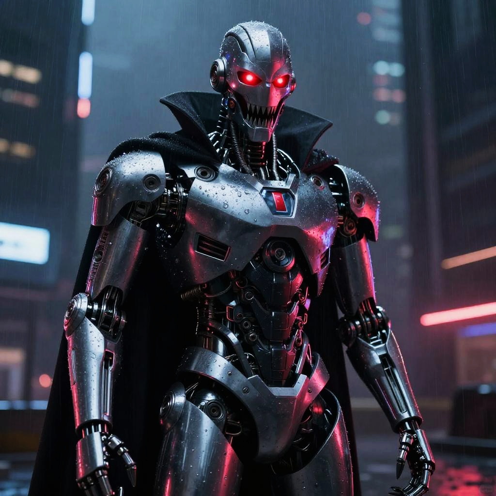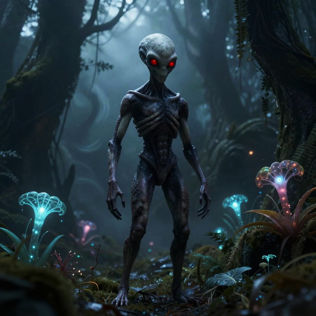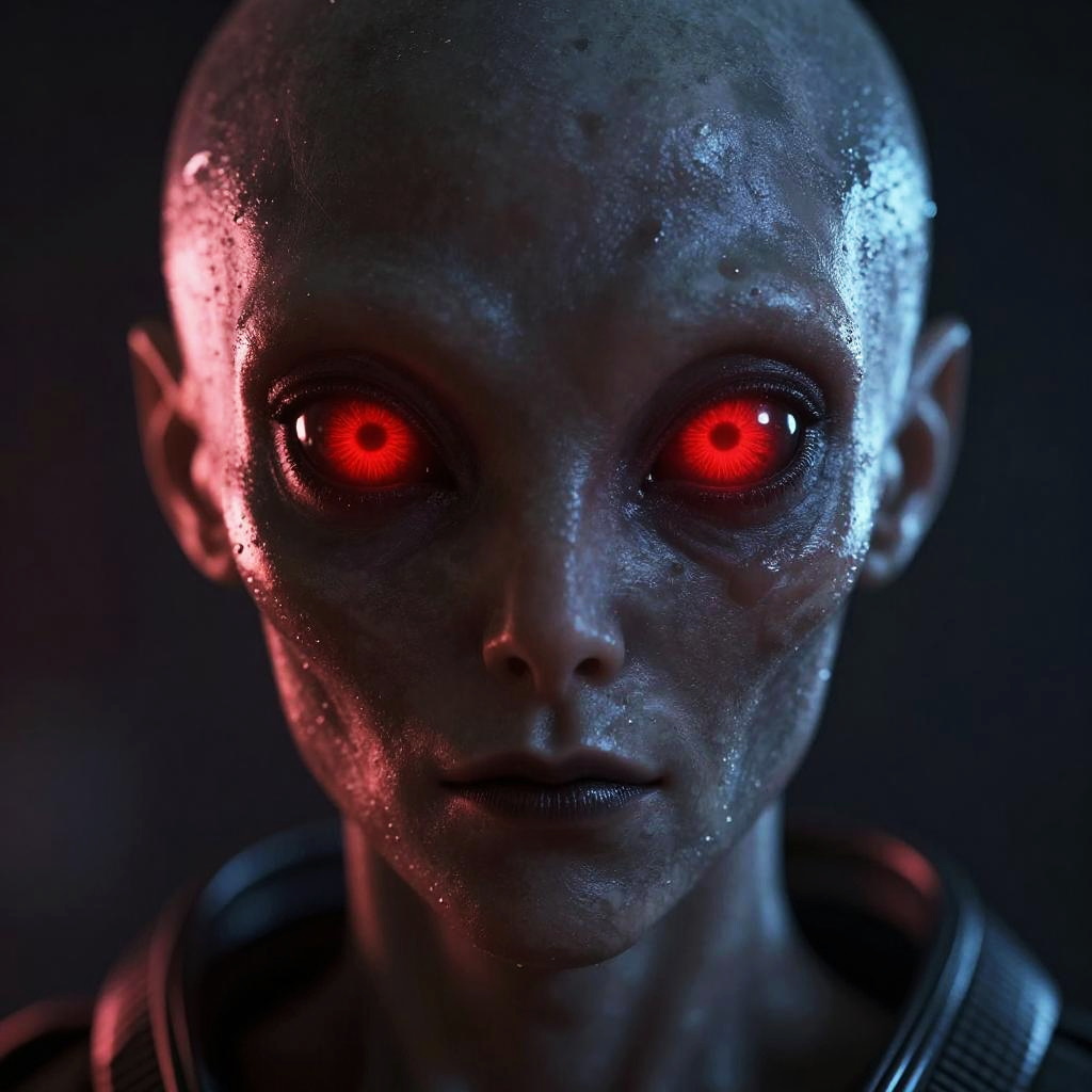 Alien with Red Eyes Over Neon City