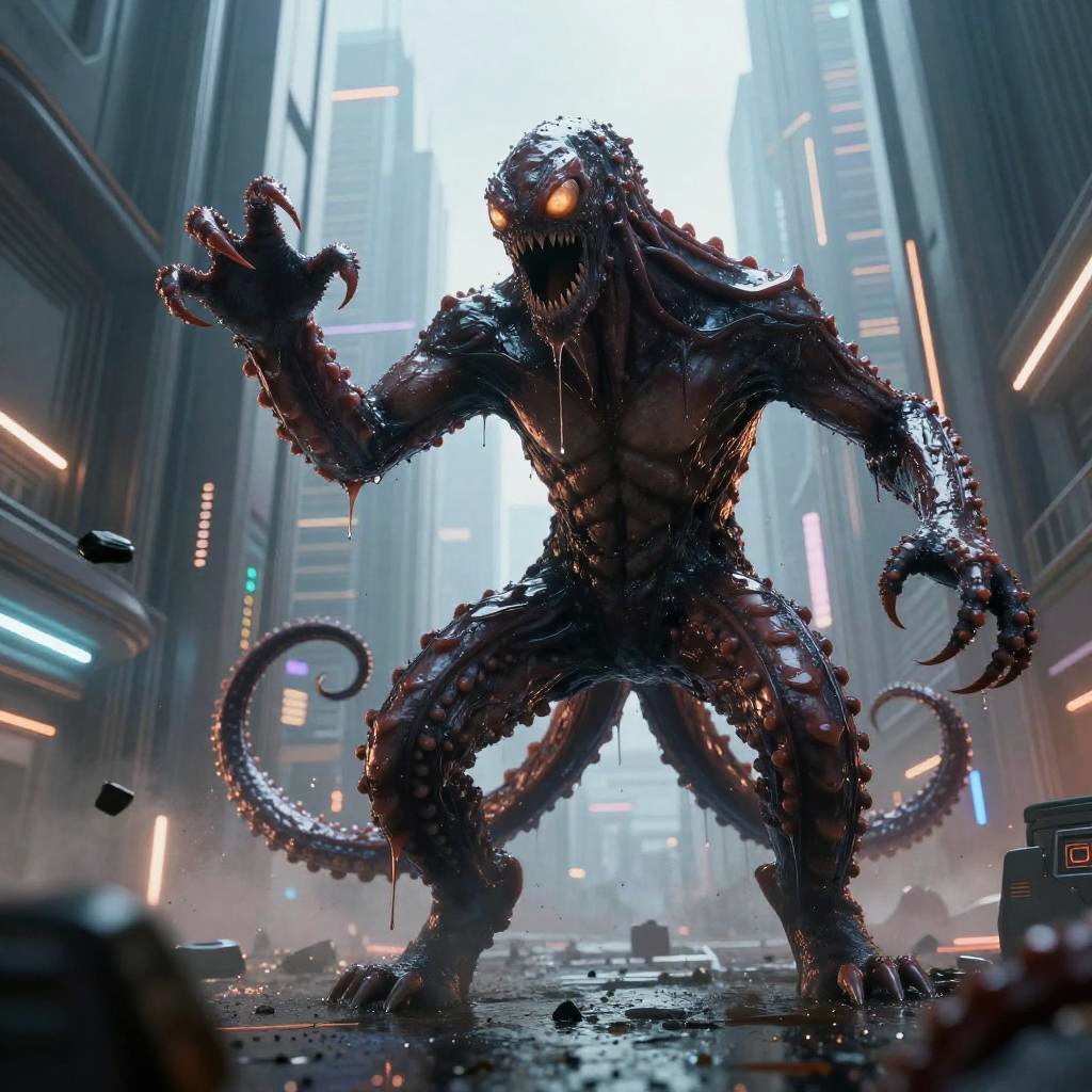 Alien with red eyes hovering above a futuristic cityscape at night, tall skyscrapers with neon signs, rain reflecting colorful lights, tense and atmospheric science fiction scene