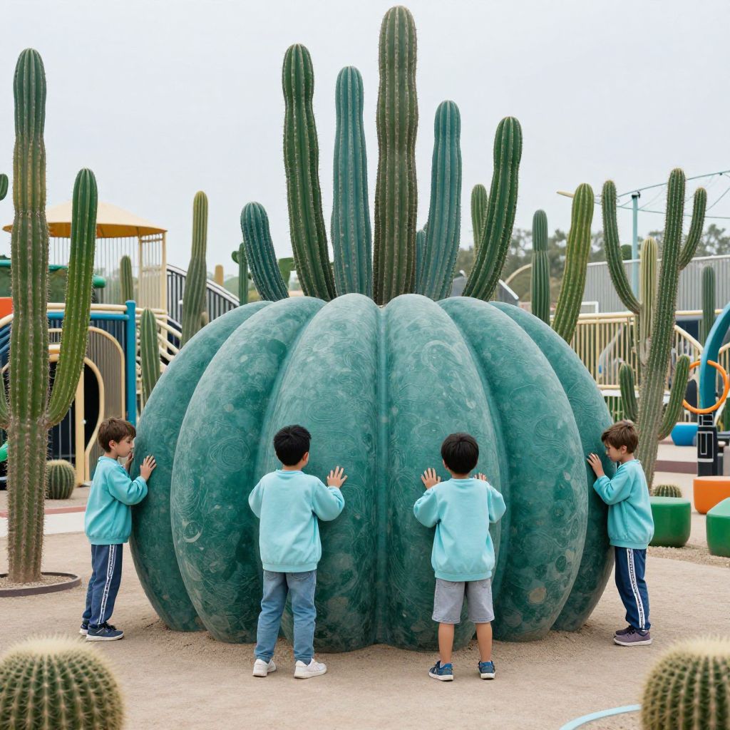 Sleeve children are playing inside an outdoor cactus playground, in the style of high quality, zhichao cai, 32k uhd, teal and green, moosa al halyan, voluminous mass, bulbous,