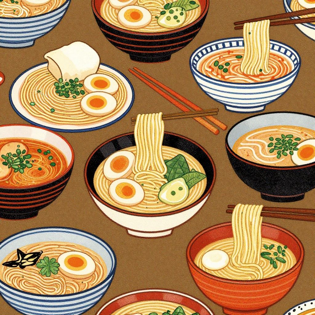 Maruchan wallpaper design showcasing various ramen ingredients like noodles, eggs, chopsticks, and broth bowls, rich warm colors with subtle texture, hand-drawn aesthetic blending traditional and contemporary Japanese art influences