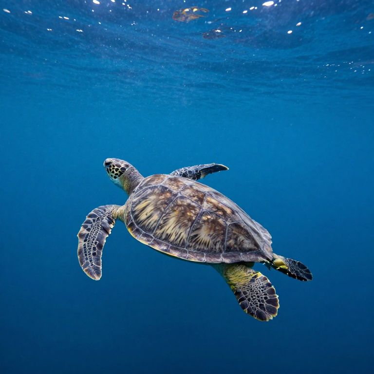 Photograph of a solitary sea turtle swimming underwater. The turtle's textured, brown and green shell with white and yellow markings is prominently displayed as it glides through the clear, deep blue ocean. Its flippers are extended, showcasing detailed, patterned skin. The background is a gradient of blue, fading from a darker shade at the top to a lighter one at the bottom, with scattered light bubbles. The turtle is centered in the frame, and the water's clarity allows for a clear view of the turtle's features and movement.