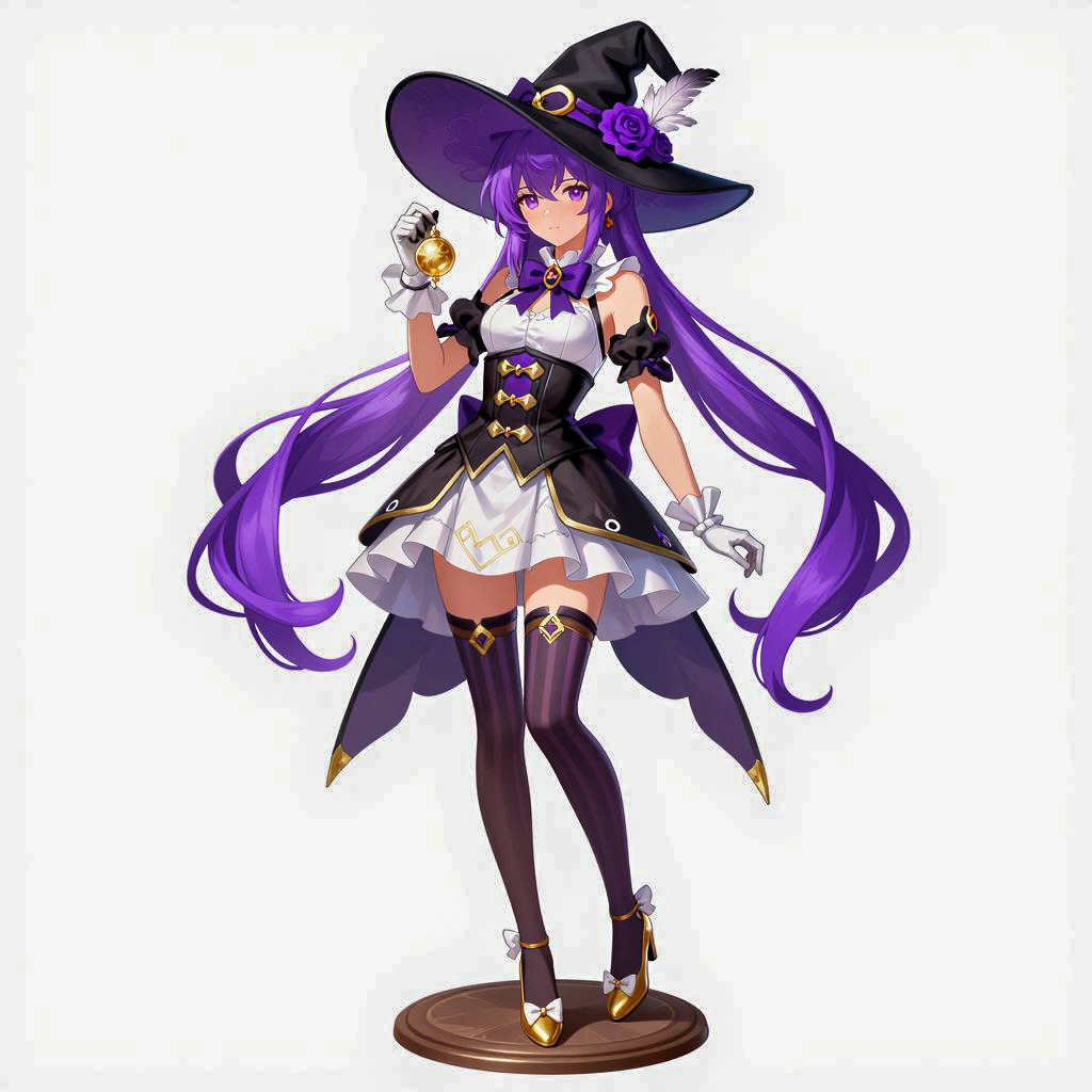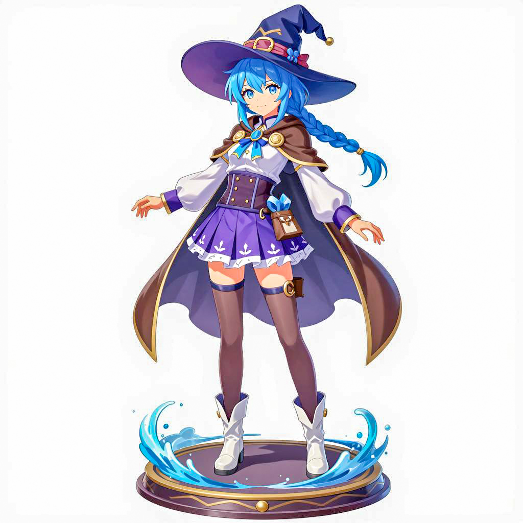Blue-haired anime girl with a long braid, wearing a wide-brimmed witch hat, white blouse, brown cape, purple skirt, thigh-high socks, and white boots. She stands on a circular base with swirling water. Her arms are outstretched, and she has a slight smile. The base has a decorative pattern and . The style is a highly detailed, digital illustration. The girl is the central focus, standing confidently with a relaxed posture.
