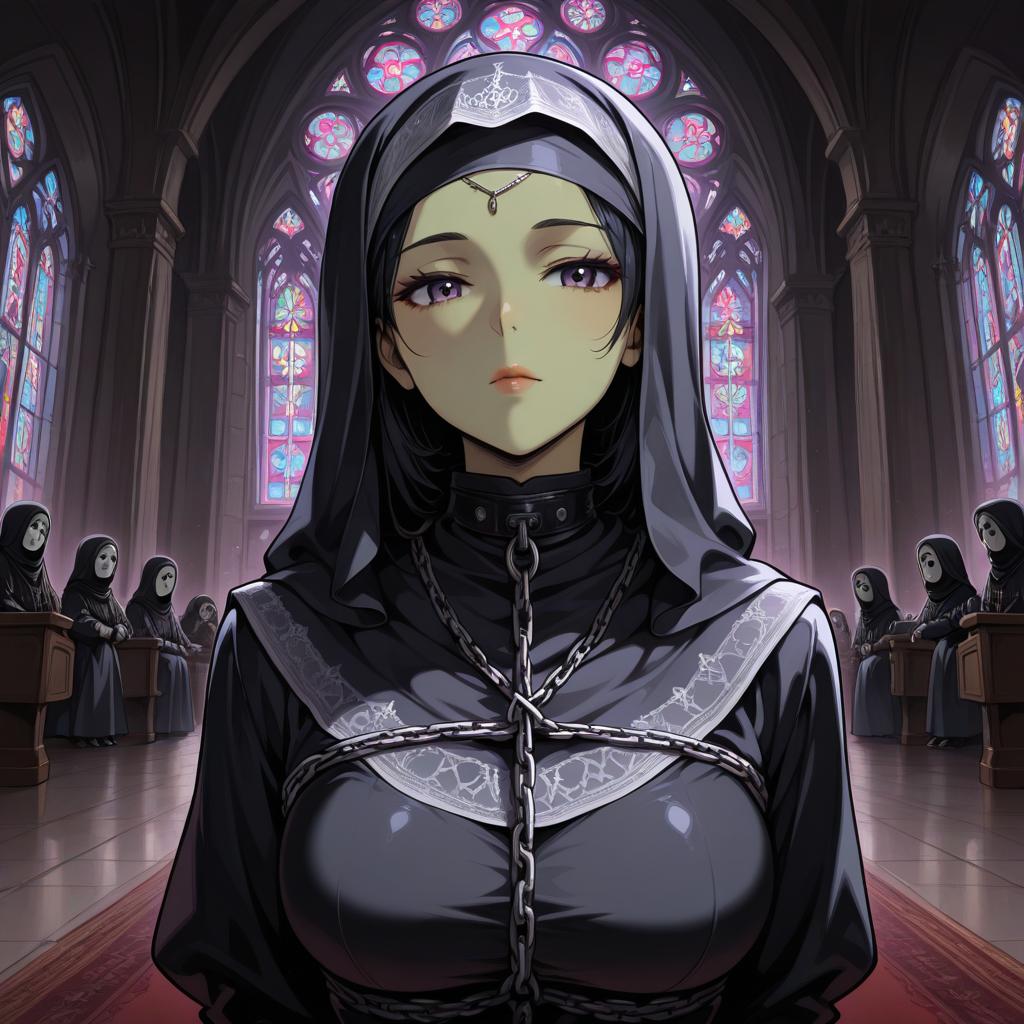 This digital anime-style illustration depicts a solemn, fair-skinned woman in a black nun's habit with a white lace collar and headpiece, featuring a chain around her neck. She has large, expressive purple eyes and a neutral expression. She stands in the foreground of a dark, Gothic-style cathedral with large, colorful stained glass windows behind her. Other nuns, similarly dressed, are seated in the background. The image has a dramatic, almost mystical atmosphere, enhanced by the soft, glowing light from the stained glass windows, which contrasts with the dark, shadowy interior.