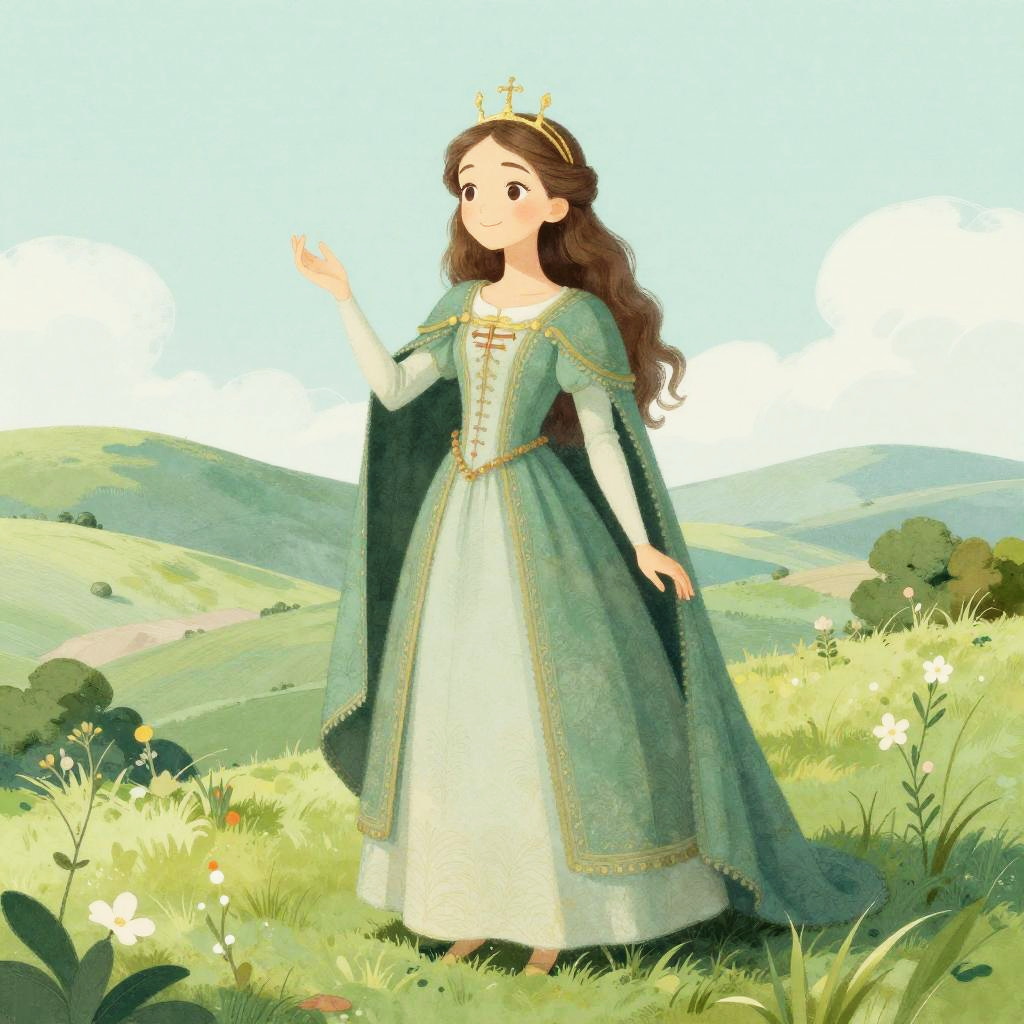 Whimsical illustration of the Merry Minotaur, inspired by medieval art, set in a soft pastel landscape with blooming wildflowers and a tranquil river. Depicted in an illuminated manuscript style, with soft colors, fine details, gentle brushstrokes, and mythical atmosphere.