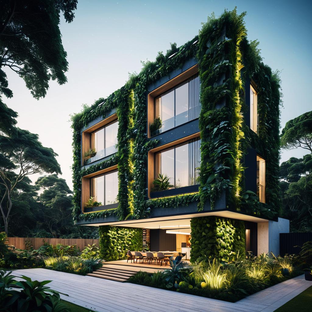 Smart cottage from the future with vertical gardens, renewable energy solutions, ultra-modern design, advanced smart technology, sustainable and eco-friendly, integrated greenery, sleek and futuristic architecture, vibrant lighting, ultra-detailed, high quality, imaginative and innovative, professional rendering