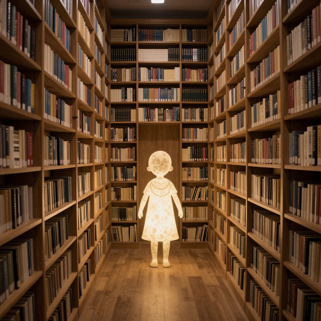 Photograph of a dimly lit library aisle with tall wooden bookshelves filled with various books on both sides. In the center, a glowing, white, child-sized silhouette figure stands illuminated from within, casting a soft light on the wooden floor. The figure has a bob haircut and wears a dress, with arms slightly outstretched. The background shelves are densely packed, creating a symmetrical, narrow corridor effect. The lighting emphasizes the figure's silhouette, contrasting with the darker, shadowed books and wooden shelves.