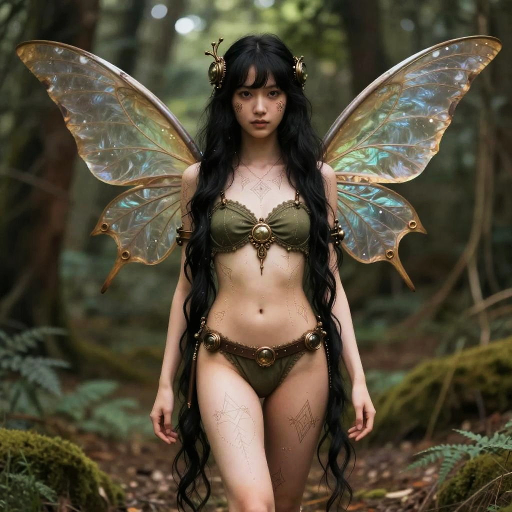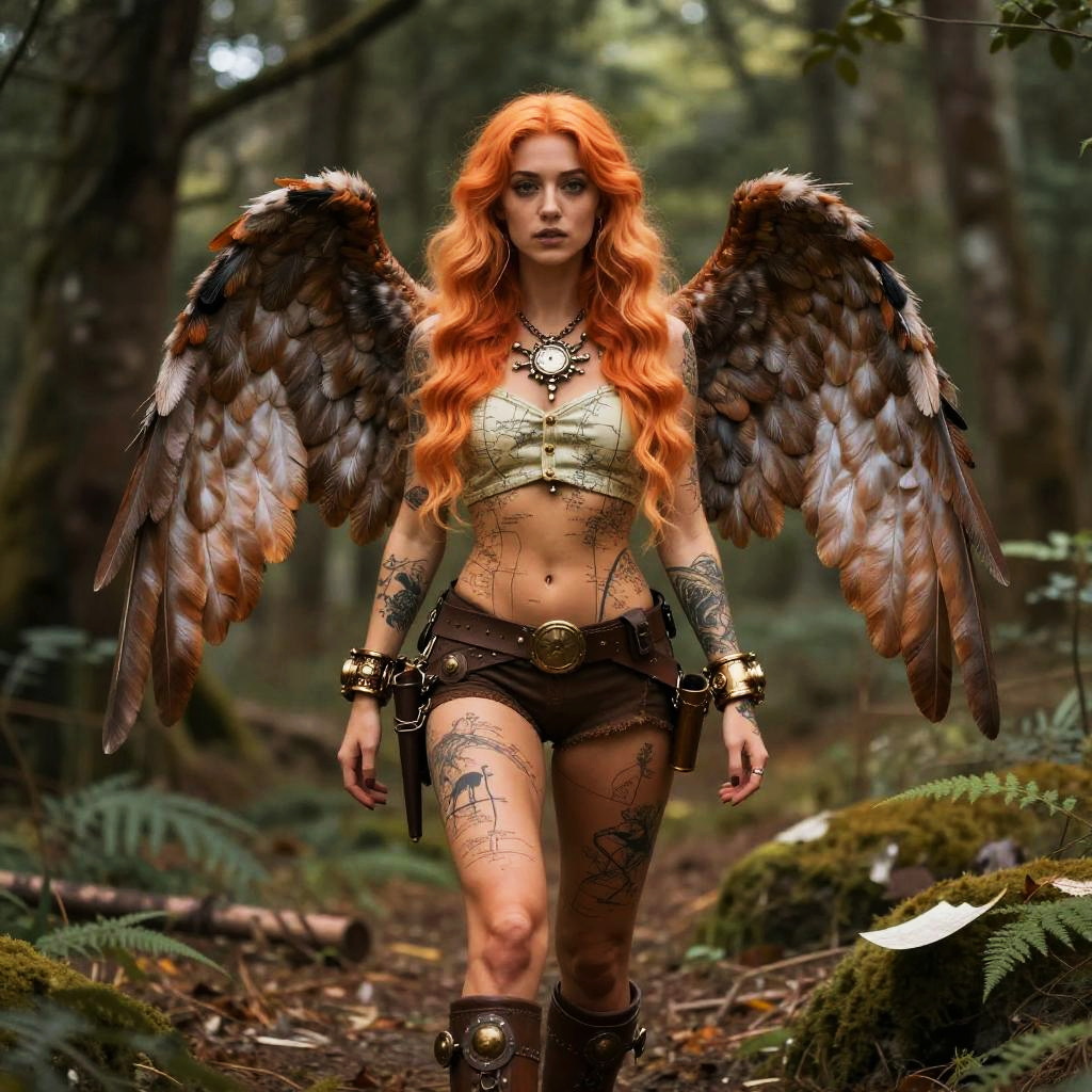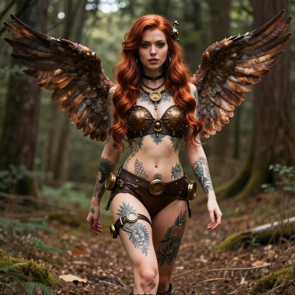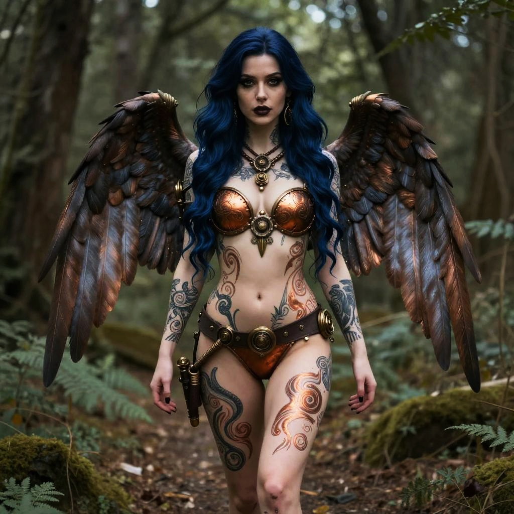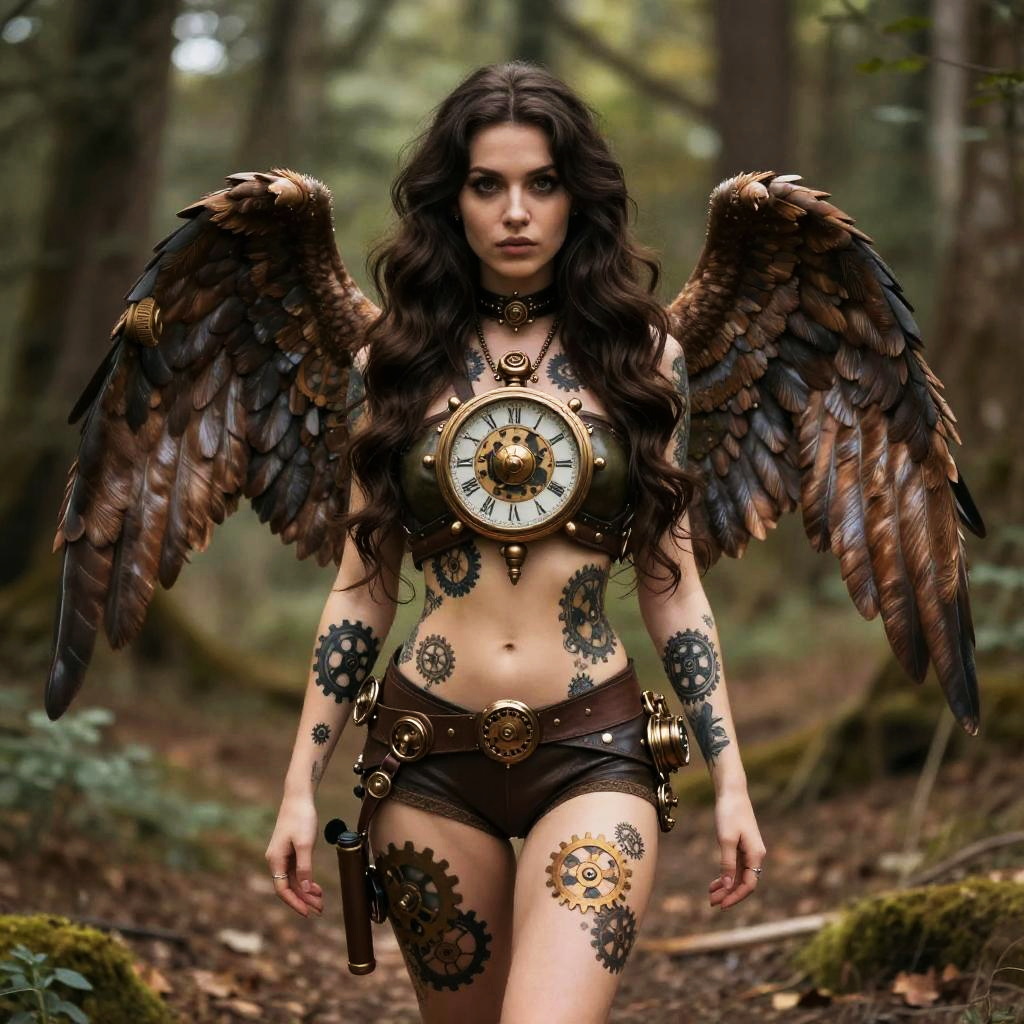 A cute 24-year-old steampunk artist standing in the woods. She has very long wavy chestnut hair that extends to her feet, large wings, and is very beautiful, with intricate patterns all over her toned sun-kissed body.
